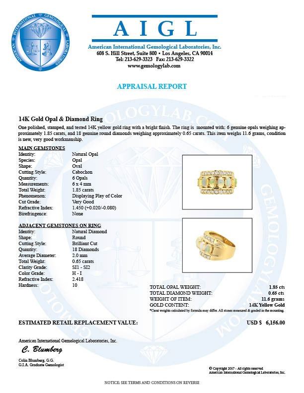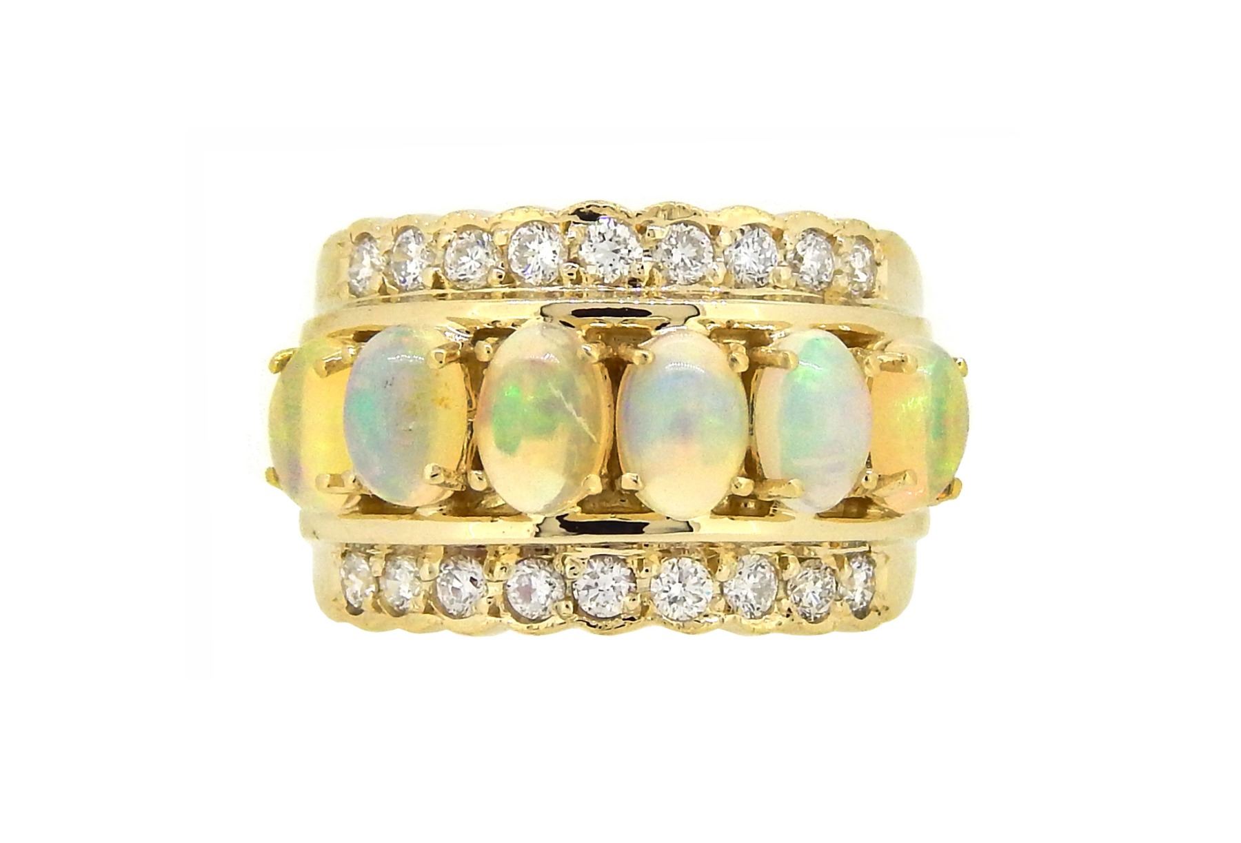One 14KT Yellow Gold 1.85ctw Opal and Diamond Ring. (6) Opals with a total weight of 1.85cts. (18) diamonds with a total weight of 0.65cts. Total weight of this ring is 11.6 grams.