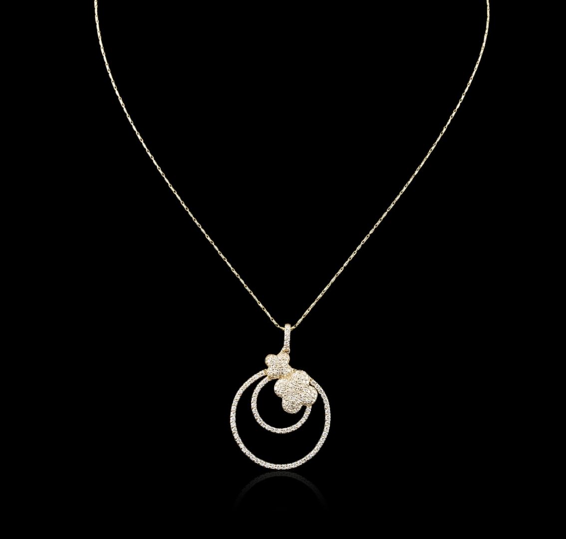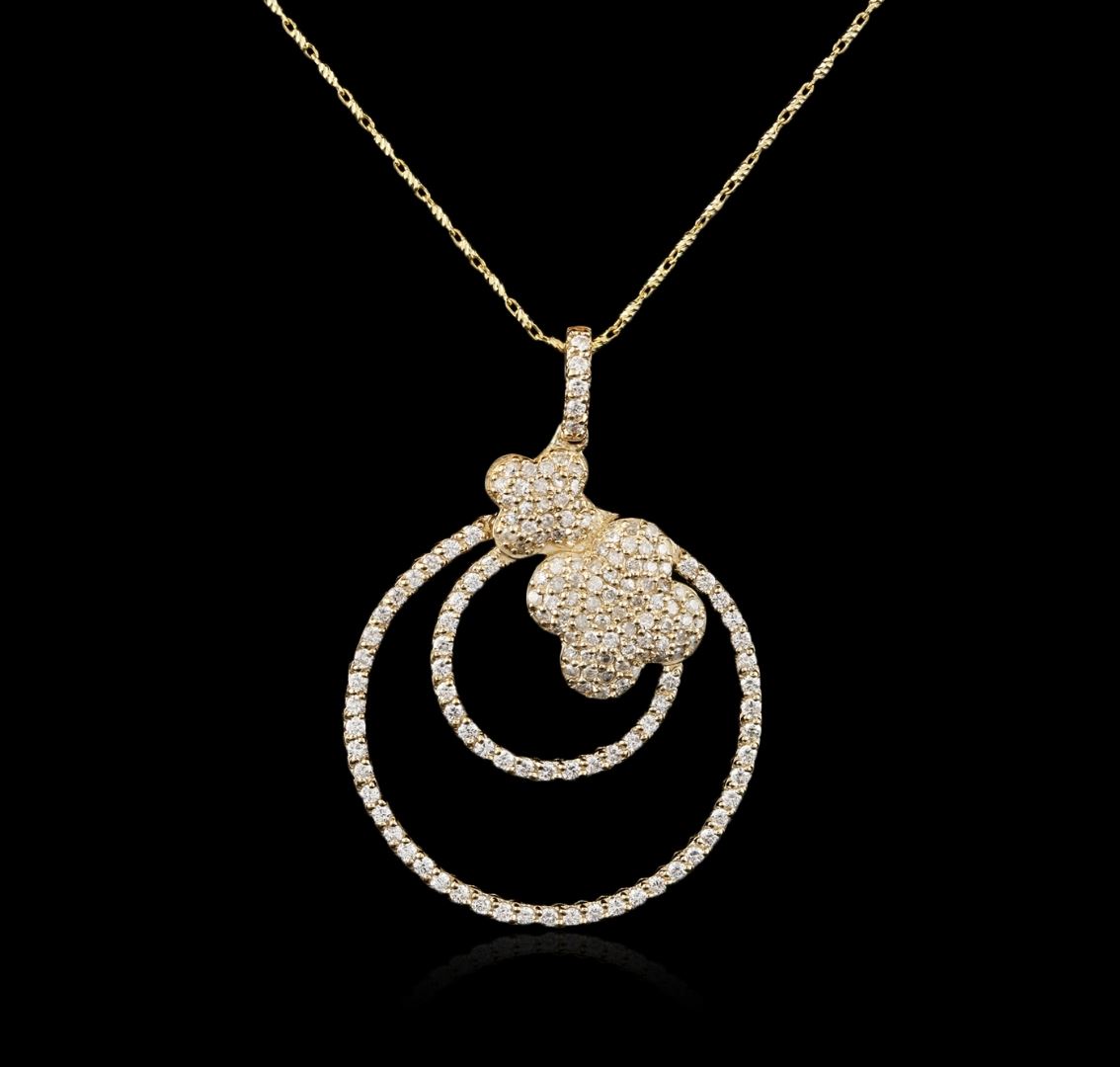 One electronically tested 14KT yellow gold ladies cast & assembled diamond pendant with chain. The pendant features two diamond set circles with two diamond set clovers, completed by a diamond set bail. The pendant is supported by an eighteen inch length 14KT yellow gold designer style chain, terminating in a lobster claw clasp. Bright polish finish. Identified with markings of "14K". Condition is new, good workmanship. Containing: One Hundred Sixty prong set round brilliant cut diamonds, measuring 1.50 - 1.40 x 0.87mm (depth est.) approximate total weight of 160 Stones = 1.87ct. Graded in the setting. Clarity: SI-2 to I-2. Color: G - I. Total Weight of Diamonds 1.87ct. Total Weight of Pendant With Chain 9.05 grams. AIG Appraised at $6,345.00.