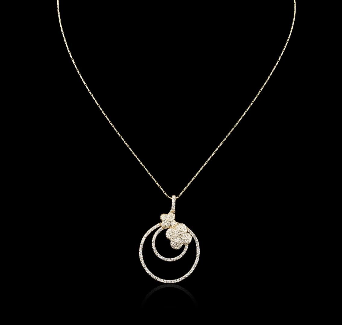 One electronically tested 14KT yellow gold ladies cast & assembled diamond pendant with chain. The pendant features two diamond set circles with two diamond set clovers, completed by a diamond set bail. The pendant is supported by an eighteen inch length 14KT yellow gold designer style chain, terminating in a lobster claw clasp. Bright polish finish. Identified with markings of "14K". Condition is new, good workmanship. Containing: One Hundred Sixty prong set round brilliant cut diamonds, measuring 1.50 - 1.40 x 0.87mm (depth est.) approximate total weight of 160 Stones = 1.87ct. Graded in the setting. Clarity: SI-2 to I-2. Color: G - I. Total Weight of Diamonds 1.87ct. Total Weight of Pendant With Chain 9.05 grams. AIG Appraised at $6,345.00.
