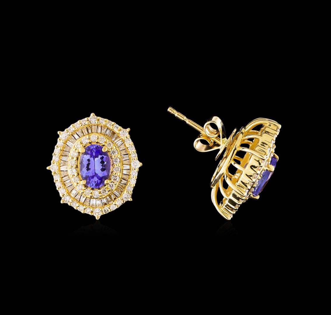 One pair electronically tested 14KT yellow gold ladies combination cast & assembled stud earrings with friction posts with a bright polish finish. Identified with markings of "14K". Condition is new. Containing: Two prong set oval modified brilliant cut natural tanzanites, measuring 7.40 x 5.32 x 3.46mm, approximate total weight of 1.88ct., clarity is eye clean, type I, medium light, very slightly grayish, violet color, (GIA V 4/3), cut is good. One Hundred prong set round brilliant cut diamonds, measuring 1.50 - 1.10 x 0.78mm (depth est.) approximate total weight of 100 Stones = 0.80ct. Clarity: SI-1 to I-1. Color: I - J, Cut is Good. Eighty channel set baguette cut diamonds, measuring 1.50 x 1.10 x 0.94mm (depth est.) approximate total weight of 80 Stones = 1.13ct. Clarity: SI-1. Color: I - J, Cut is Good. Colored gemstones are presumed to have been subjected to commonly used enhancement processes. All diamonds and colored gemstones are graded in the mounting, unless otherwise stated. Total Weight of Colored Stones 1.88ct. Total Weight of Diamonds 1.93ct. Total Weight of Earrings 8.10 grams. GGL Appraised at $9,905.00.