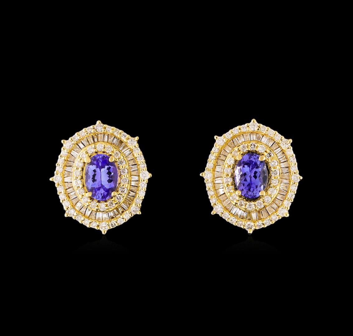 One pair electronically tested 14KT yellow gold ladies combination cast & assembled stud earrings with friction posts with a bright polish finish. Identified with markings of "14K". Condition is new. Containing: Two prong set oval modified brilliant cut natural tanzanites, measuring 7.40 x 5.32 x 3.46mm, approximate total weight of 1.88ct., clarity is eye clean, type I, medium light, very slightly grayish, violet color, (GIA V 4/3), cut is good. One Hundred prong set round brilliant cut diamonds, measuring 1.50 - 1.10 x 0.78mm (depth est.) approximate total weight of 100 Stones = 0.80 ct. Clarity: SI-1 to I-1. Color: I - J, Cut is Good. Eighty channel set baguette cut diamonds, measuring 1.50 x 1.10 x 0.94mm (depth est.) approximate total weight of 80 Stones = 1.13ct. Clarity: SI-1. Color: I - J, Cut is Good. Colored gemstones are presumed to have been subjected to commonly used enhancement processes. All diamonds and colored gemstones are graded in the mounting, unless otherwise stated. Total Weight of Colored Stones 1.88ct. Total Weight of Diamonds 1.93ct. Total Weight of Earrings 8.10 grams. GGL Appraised.