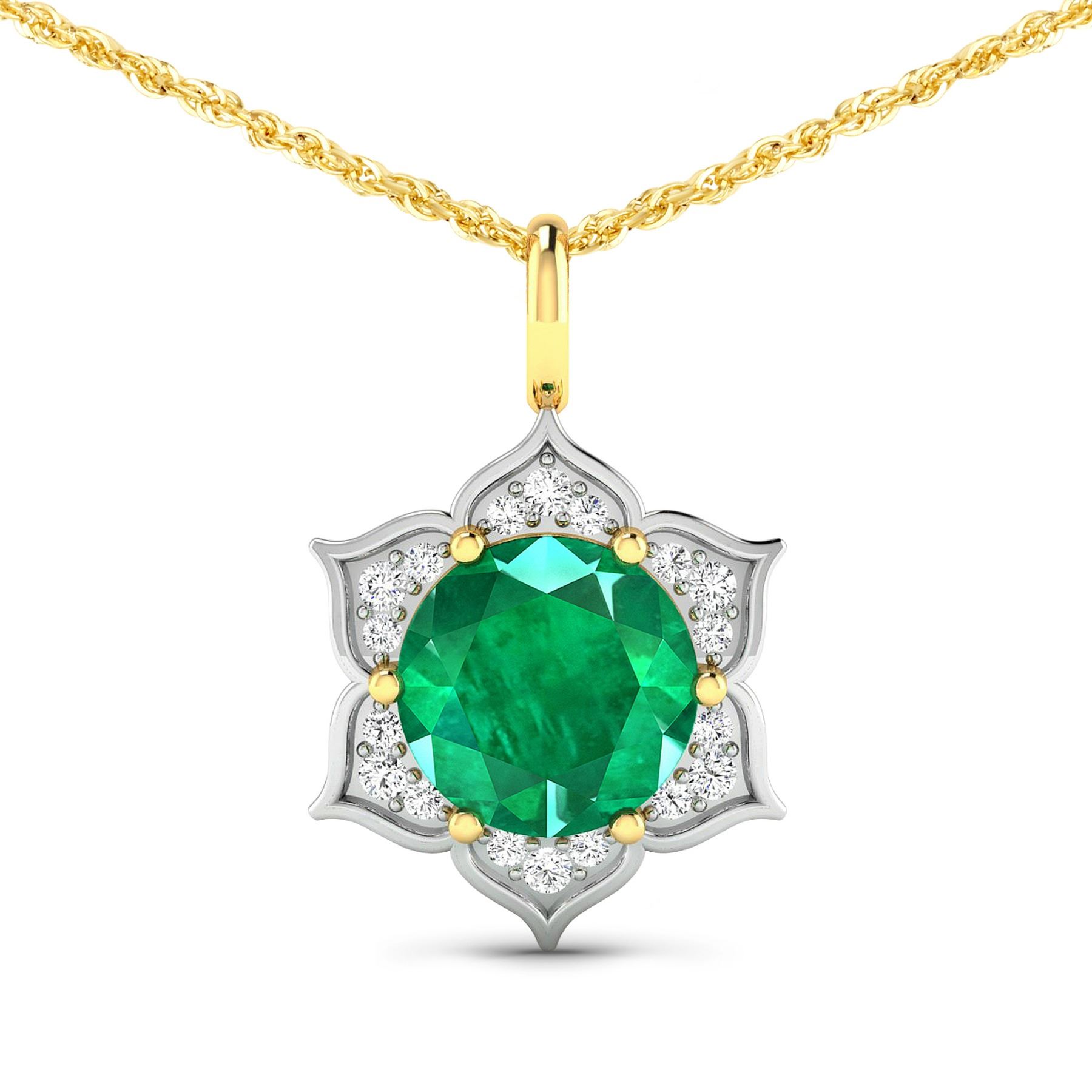 Zambian Emerald (AA) Round 8.00mm - 1Pc + White Diamond F/C Round 1.30mm - 6Pcs + White Diamond F/C Round 1.10mm - 12Pcs ( White Pan Rhodium ) ( SI2/HI color ) Total weight of gemstone is 1.8cts. Total Diamond weight is 0.14cts. Total weight of this pendant is 2.01 grams.