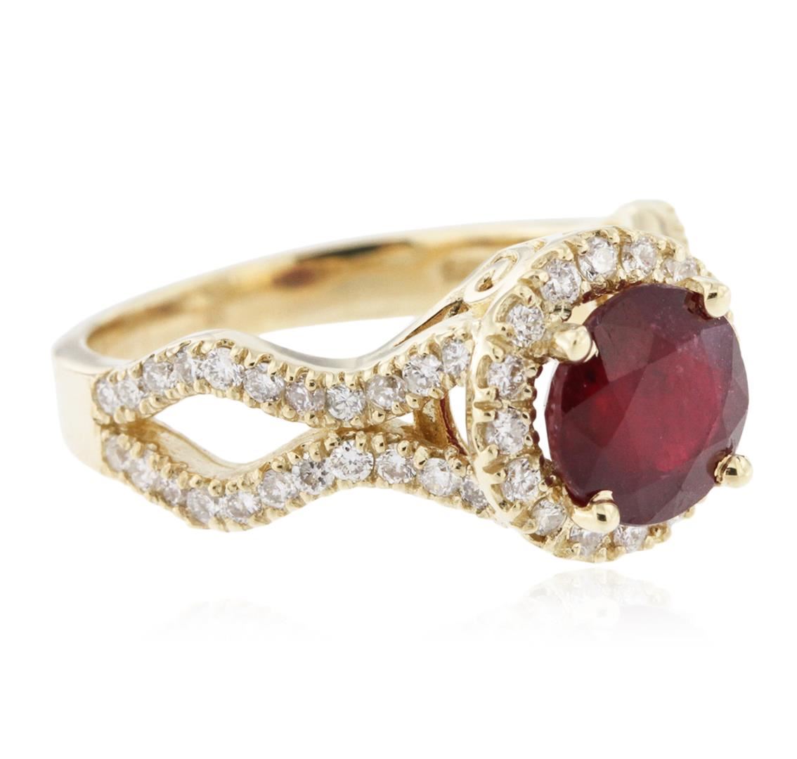 One electronically tested 14KT yellow gold ladies cast ruby and diamond ring with a bright polish finish. Identified with markings of "14K". Condition is new. Containing: One prong set round modified brilliant cut natural ruby, measuring 7.20 - 7.20 x 4.68 mm, approximate weight of 1.94ct., clarity is heavily included, type II, medium dark, very slightly brownish, strongly purplish red color, (GIA stpR 6/3), cut is good. Sixty-Six prong set round brilliant cut diamonds, measuring 1.30 - 1.30 x 0.78mm (depth est.) approximate total weight of 66 Stones = 0.53ct. Clarity: SI-2 to I-1. Color: I - J, Cut is Good. Colored gemstones are presumed to have been subjected to commonly used enhancement processes. All diamonds and colored gemstones are graded in the mounting, unless otherwise stated. Total Weight of Colored Stones 1.94ct. Total Weight of Diamonds 0.53ct. Total Weight of Ring 4.60 grams. GGL Appraised at $3,030.00.