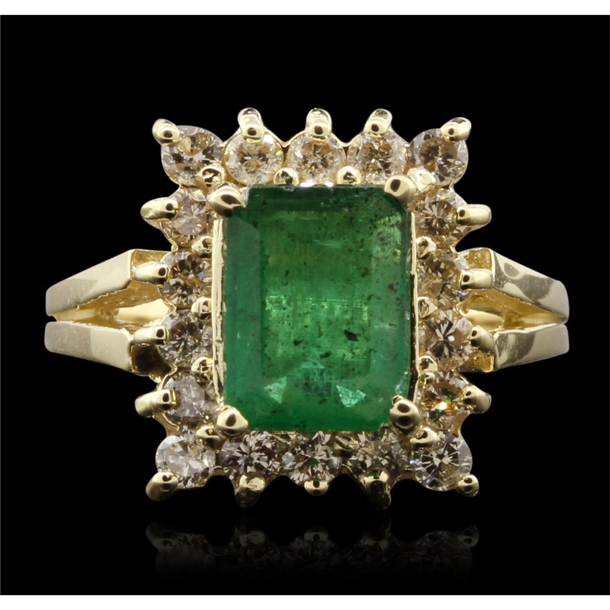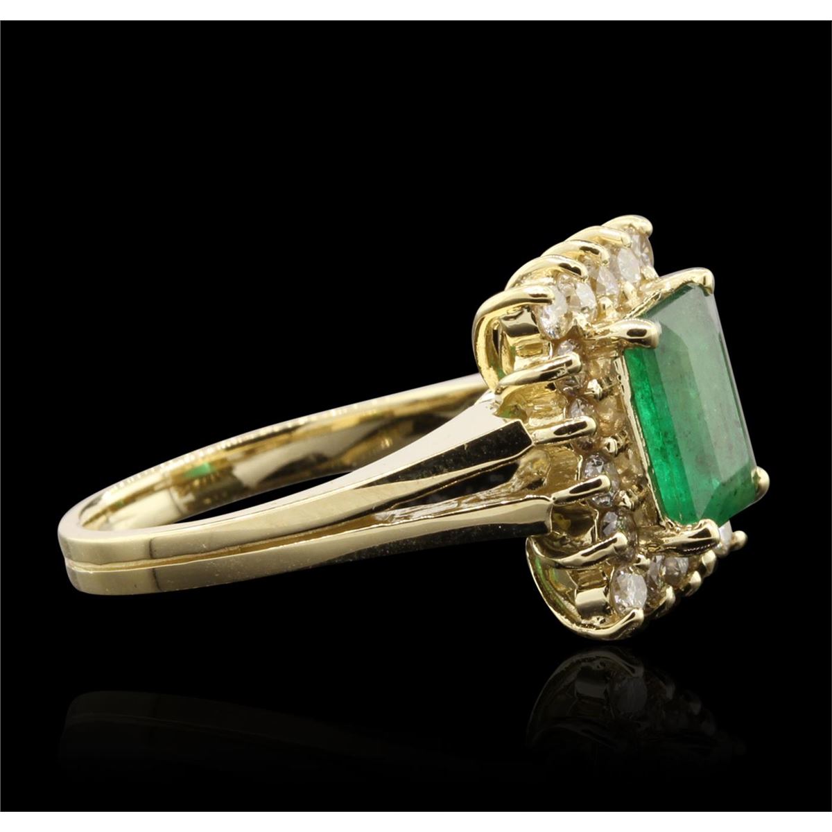 One electronically tested 14KT yellow gold ladies cast emerald and diamond ring with a bright polish finish. The featured emerald is set within a diamond bezel, supported by split shoulders and completed by a two and one-half millimeter wide band. Identified with markings of "K14". Condition is new, good workmanship. Containing: One prong set rectangular step cut natural emerald, measuring 8.90 x 6.50 x 3.80mm, 8%. bulge factor, approximate weight of 1.94ct., clarity is heavily included, type III, medium dark, very slightly grayish, very slightly bluish green color, (GIA vslbG 6/3), cut is good. Transmitting light with a minimum of distortion, transparent to translucent. Naturally occurring internal & external characteristics are present. Indications of oil residue. Graded in the setting. Eighteen prong set round brilliant cut diamonds, measuring 2.20 - 2.10 x 1.29mm (depth est.) approximate. Total Weight of 18 Stones = 0.75ct. Graded in the setting. Clarity: SI-2 to I-1 . Color: I - K. Total Weight of Colored Stones 1.94ct. Total Weight of Diamonds 0.75ct. AIG Appraised at $4,585.00.