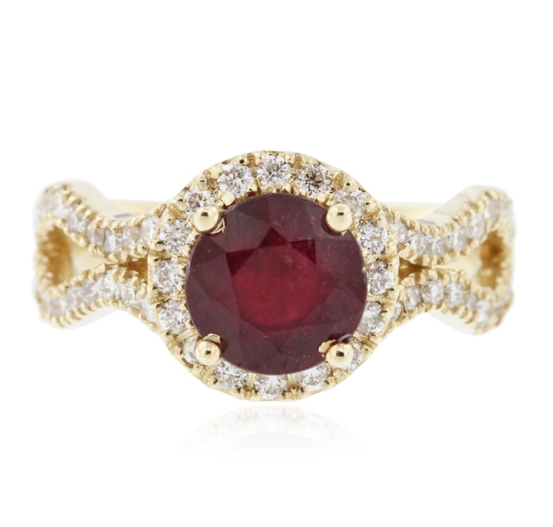 One electronically tested 14KT yellow gold ladies cast ruby and diamond ring with a bright polish finish. Identified with markings of "14K". Condition is new. Containing: One prong set round modified brilliant cut natural ruby, measuring 7.20 - 7.20 x 4.68 mm, approximate weight of 1.94ct., clarity is heavily included, type II, medium dark, very slightly brownish, strongly purplish red color, (GIA stpR 6/3), cut is good. Sixty-Six prong set round brilliant cut diamonds, measuring 1.30 - 1.30 x 0.78mm (depth est.) approximate total weight of 66 Stones = 0.53ct. Clarity: SI-2 to I-1. Color: I - J, Cut is Good. Colored gemstones are presumed to have been subjected to commonly used enhancement processes. All diamonds and colored gemstones are graded in the mounting, unless otherwise stated. Total Weight of Colored Stones 1.94ct. Total Weight of Diamonds 0.53ct. Total Weight of Ring 4.60 grams. GGL Appraised at $3,030.00.