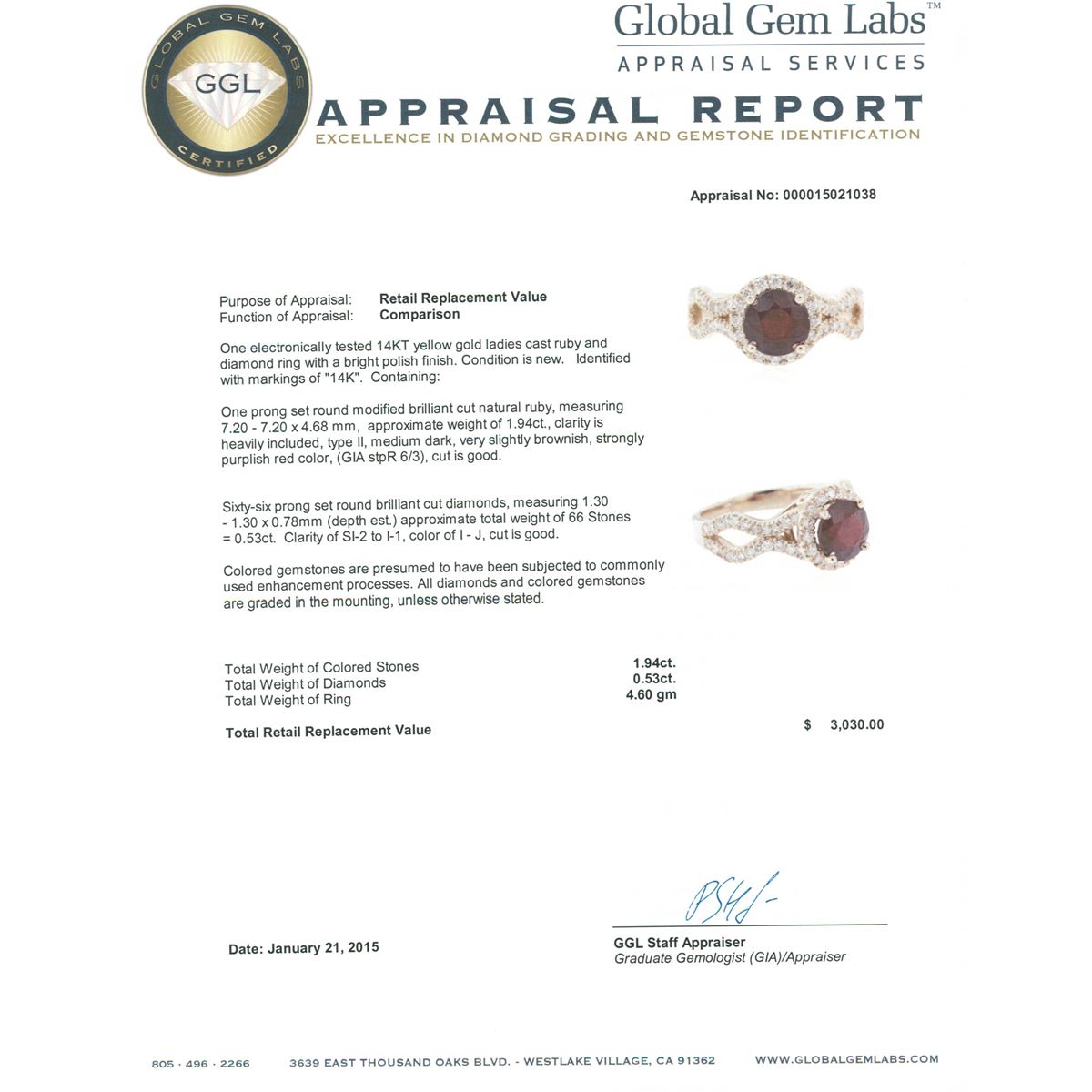 One electronically tested 14KT yellow gold ladies cast ruby and diamond ring with a bright polish finish. Identified with markings of "14K". Condition is new. Containing: One prong set round modified brilliant cut natural ruby, measuring 7.20 - 7.20 x 4.68 mm, approximate weight of 1.94ct., clarity is heavily included, type II, medium dark, very slightly brownish, strongly purplish red color, (GIA stpR 6/3), cut is good. Sixty-Six prong set round brilliant cut diamonds, measuring 1.30 - 1.30 x 0.78mm (depth est.) approximate total weight of 66 Stones = 0.53ct. Clarity: SI-2 to I-1. Color: I - J, Cut is Good. Colored gemstones are presumed to have been subjected to commonly used enhancement processes. All diamonds and colored gemstones are graded in the mounting, unless otherwise stated. Total Weight of Colored Stones 1.94ct. Total Weight of Diamonds 0.53ct. Total Weight of Ring 4.60 grams. GGL Appraised at $3,030.00.