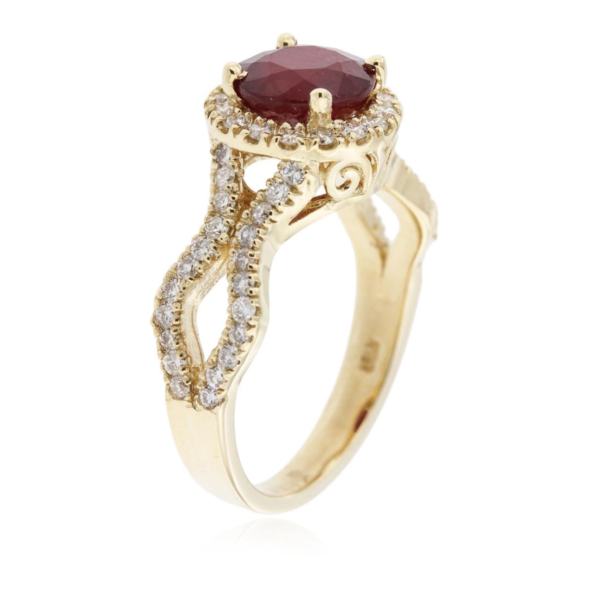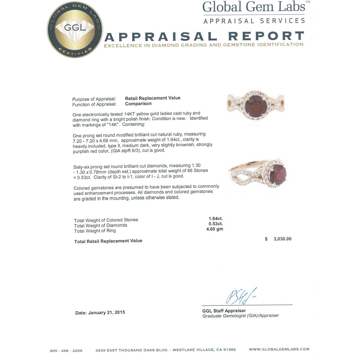 One electronically tested 14KT yellow gold ladies cast ruby and diamond ring with a bright polish finish. Identified with markings of "14K". Condition is new. Containing: One prong set round modified brilliant cut natural ruby, measuring 7.20 - 7.20 x 4.68 mm, approximate weight of 1.94ct., clarity is heavily included, type II, medium dark, very slightly brownish, strongly purplish red color, (GIA stpR 6/3), cut is good. Sixty-Six prong set round brilliant cut diamonds, measuring 1.30 - 1.30 x 0.78mm (depth est.) approximate total weight of 66 Stones = 0.53ct. Clarity: SI-2 to I-1. Color: I - J, Cut is Good. Colored gemstones are presumed to have been subjected to commonly used enhancement processes. All diamonds and colored gemstones are graded in the mounting, unless otherwise stated. Total Weight of Colored Stones 1.94ct. Total Weight of Diamonds 0.53ct. Total Weight of Ring 4.60 grams. GGL Appraised at $3,030.00.
