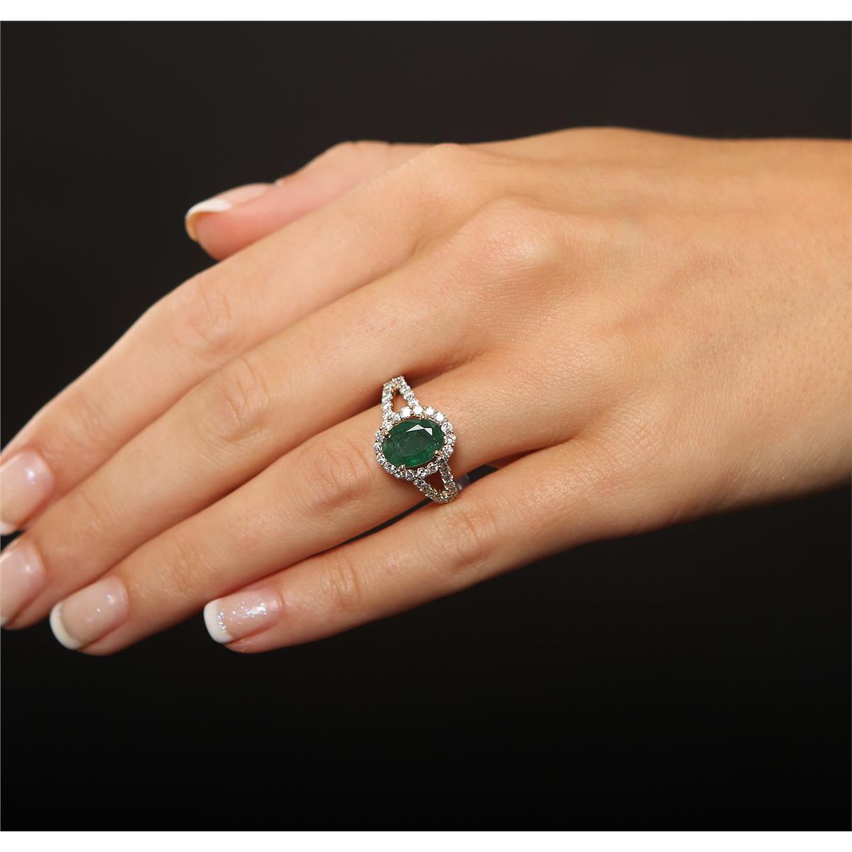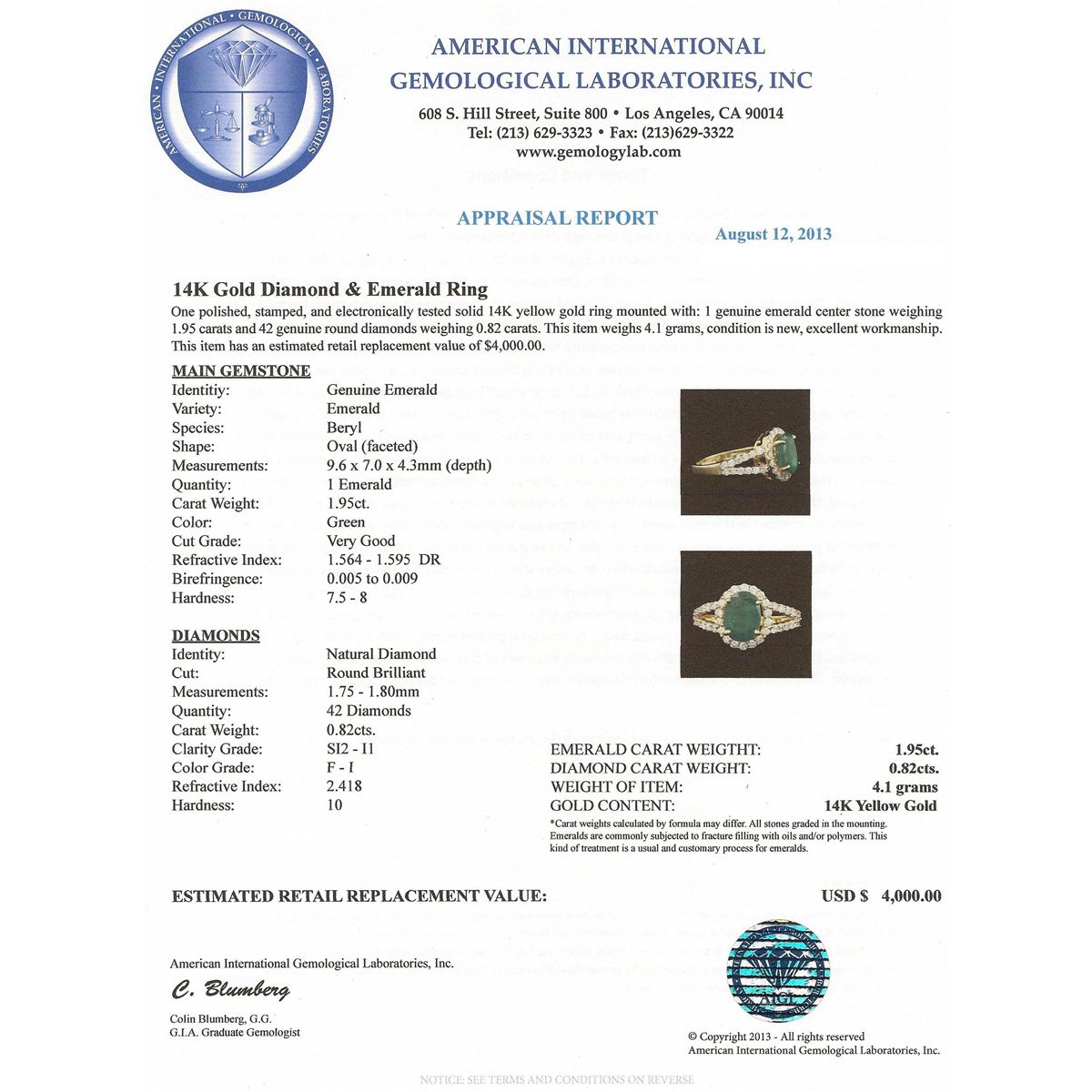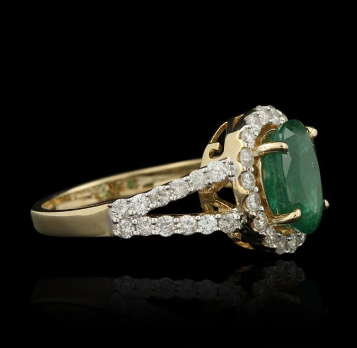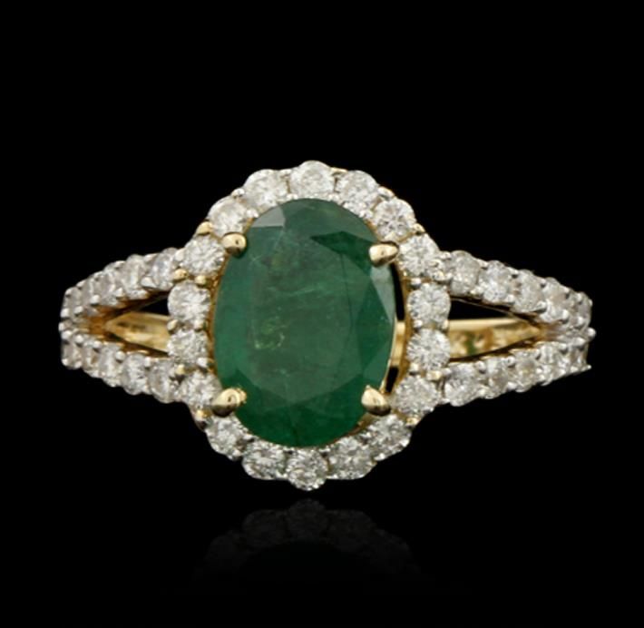 One polished, stamped, and electronically tested solid 14K yellow gold ring mounted with: 1 genuine emerald center stone weighing 1.95 carats and 42 genuine round diamonds weighing 0.82 carats. This item weighs 4.1 grams, condition is new, excellent workmanship. AIGL Appraised at $4,000.00.
