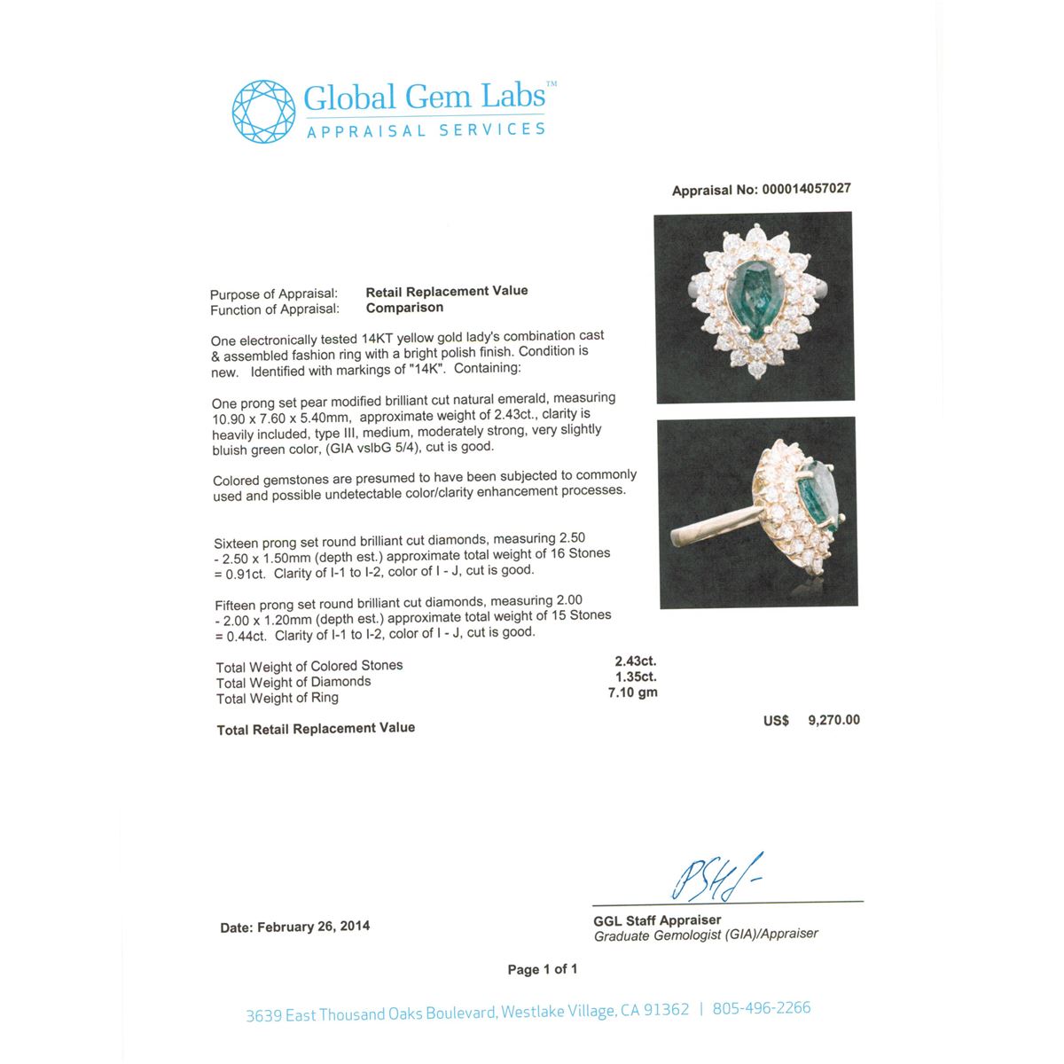 Great Condition! One electronically tested 14KT yellow gold Ladies combination cast & assembled fashion ring with a bright polish finish. Condition is new. Identified with markings of "14K". Containing: One prong set emerald standard step cut natural emerald, measuring 9.10 x 7.00 x 3.80mm, approximate weight of 1.95ct., clarity is moderately included, type III, medium, very slightly grayish, very slightly bluish green color, (GIA vslbG 5/3), cut is good. Colored gemstones are presumed to have been subjected to commonly used and possible undetectable color/clarity enhancement processes. Twelve prong set round brilliant cut diamonds, measuring 3.00 - 3.00 x 1.80mm (depth est.) approximate total weight of 12 Stones = 1.19ct. Clarity of SI-2 to I-1, Color of I - J, Cut is Good. Total Weight of Colored Stones 1.95ct. Total Weight of Diamonds 1.19ct. Total Weight of Ring 7.80 grams. GGL Appraised at $9,160.00.