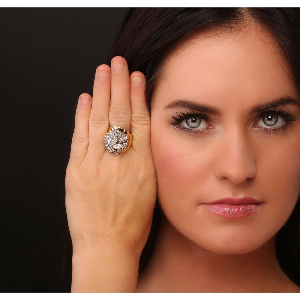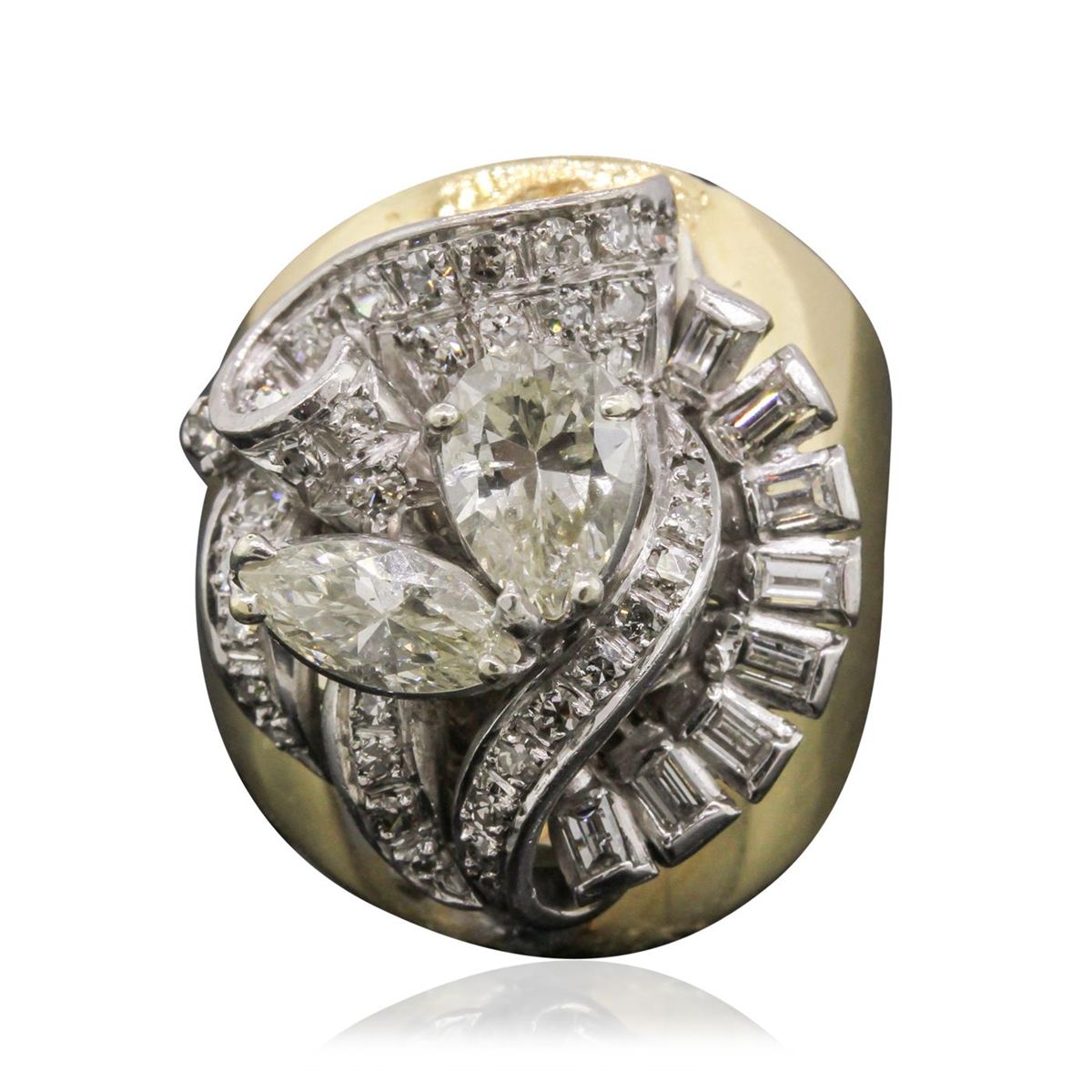 One electronically tested 14KT yellow gold Ladies combination cast & assembled ring with a bright polish finish. Condition is very good. Containing: One prong set pear shaped cut diamond, measuring 7.50 x 5.30 x 3.34mm (depth est.) approximate weight of 0.80ct. Clarity: I-1. Color: K, Cut is Good. One prong set marquise shaped cut diamond, measuring 8.50 x 4.30 x 2.71mm (depth est.) approximate weight of 0.57ct. Clarity: I-1. Color: K, Cut is Good. Thirty-Four bead set single cut diamonds, measuring 1.40 - 1.40 x 0.84mm (depth est.) approximate. Total Weight of 34 Stones = 0.34ct. Clarity: SI-2. Color: I - J, Cut is Good. Eight prong set baguette cut diamonds, measuring 2.50 x 1.30 x 1.11mm (depth est.) approximate. Total Weight of 8 Stones = 0.24ct. Clarity: SI-2. Color: I - J, Cut is Good. Total Weight of Diamonds 1.95ct. Total Weight of Ring 16.80 grams. GGL Appraised at $12,690.00.