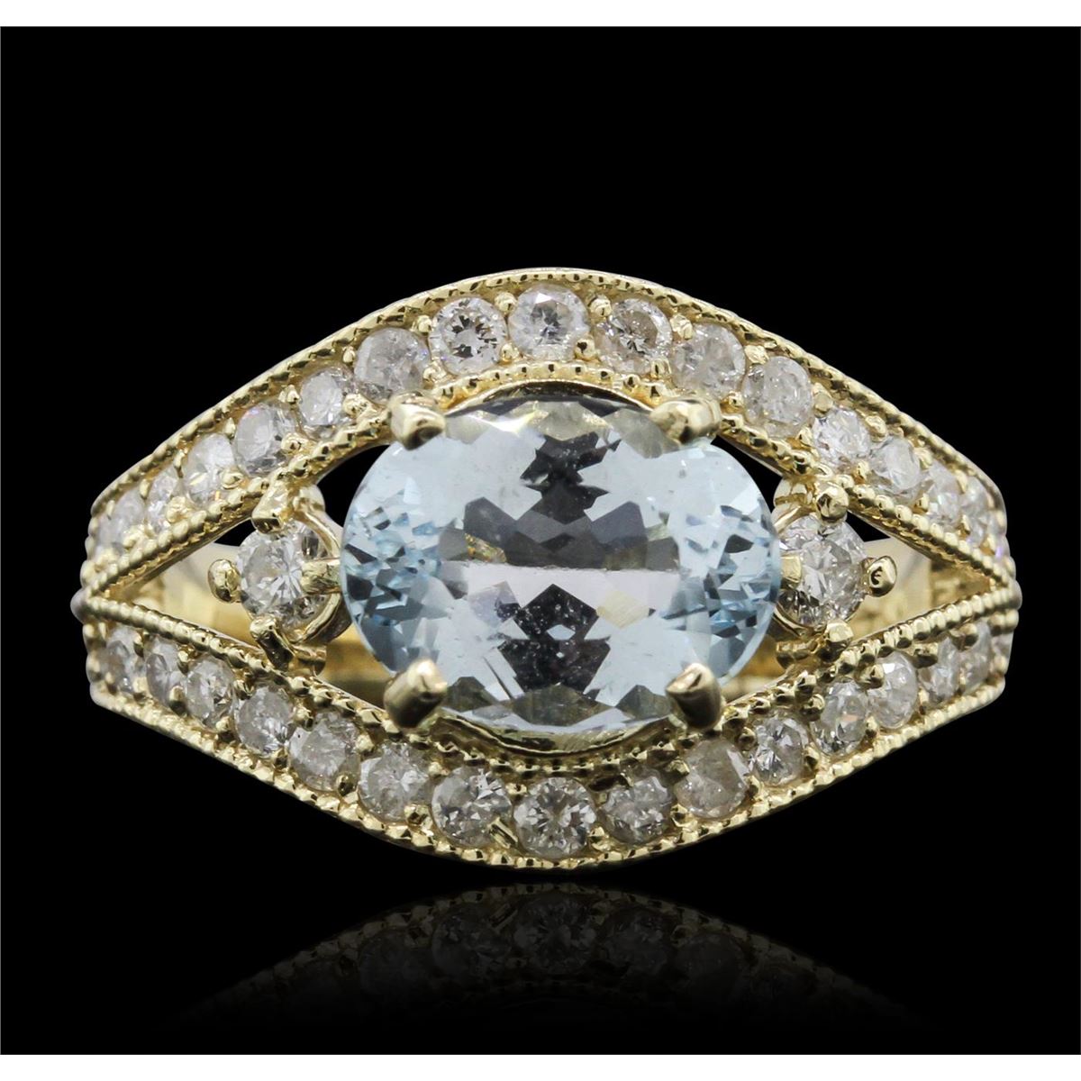 One electronically tested 14KT yellow gold ladies cast aquamarine and diamond ring. Condition is new, good workmanship. The featured aquamarine is framed by mirroring ribbons of diamonds, completed by a three millimeter wide band. Bright polish finish with milgrain detailing throughout. Identified with markings of "K14". Containing: One prong set oval mixed cut natural aquamarine, measuring 9.35 x 7.15 x 4.90mm, 8%. bulge factor, approximate weight of 1.96ct., clarity is eye clean, type I, medium light, very slightly grayish, very slightly greenish blue color, (GIA vslgB 4/3), cut is good. Transmitting light with no distortion, transparent. Refractive index testing results of 1.56 to 1.57. This is a conclusive result for Aquamarine (Beryl). Graded in the setting. Two prong set round brilliant cut diamonds, measuring 2.40 - 2.40 x 1.44mm (depth est.) approximate. Total Weight of 2 Stones = 0.12ct. Graded in the setting. Clarity: I-1 to I-2. Color: H - I Nineteen bead set round brilliant cut diamonds, measuring 1.80 - 1.70 x 1.05mm (depth est.) approximate. Total Weight of 19 Stones = 0.48ct. Graded in the setting. Clarity: I-1 to I-2. Color: H - J. Total Weight of Colored Stones 1.96ct.. Total Weight of Diamonds 0.60ct. Total Weight of Ring 5.80 grams. AIG Appraised at $3,260.00.
