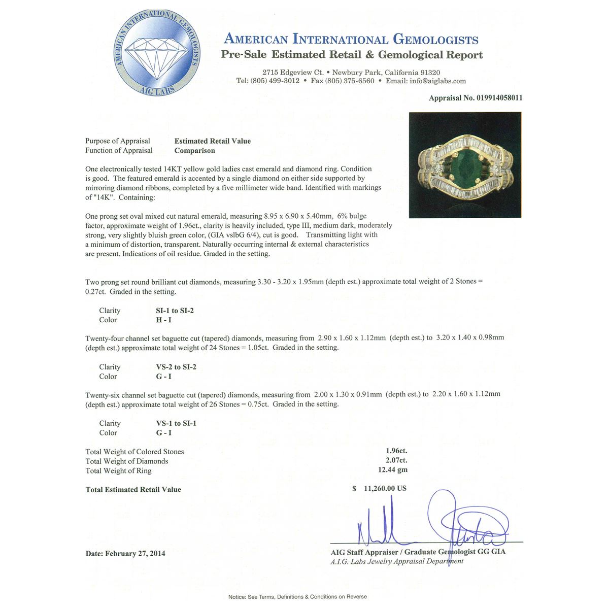 One electronically tested 14KT yellow gold ladies cast emerald and diamond ring. Condition is good. The featured emerald is accented by a single diamond on either side supported by mirroring diamond ribbons, completed by a five millimeter wide band. Identified with markings of "14K". Containing: One prong set oval mixed cut natural emerald, measuring 8.95 x 6.90 x 5.40mm, 6%. bulge factor, approximate weight of 1.96ct., clarity is heavily included, type III, medium dark, moderately strong, very slightly bluish green color, (GIA vslbG 6/4), cut is good. Transmitting light with a minimum of distortion, transparent. Naturally occurring internal & external characteristics are present. Indications of oil residue. Graded in the setting. Two prong set round brilliant cut diamonds, measuring 3.30 - 3.20 x 1.95mm (depth est.) approximate. Total Weight of 2 Stones = 0.27ct. Graded in the setting. Clarity: SI-1 to SI-2. Color: H - I Twenty-Four channel set baguette cut (tapered) diamonds, measuring from 2.90 x 1.60 x 1.12mm (depth est.) to 3.20 x 1.40 x 0.98mm (depth est.) approximate. Total Weight of 24 Stones = 1.05ct. Graded in the setting. Clarity: VS-2 to SI-2. Color: G - I Twenty-Six channel set baguette cut (tapered) diamonds, measuring from 2.00 x 1.30 x 0.91mm (depth est.) to 2.20 x 1.60 x 1.12mm (depth est.) approximate. Total Weight of 26 Stones = 0.75ct. Graded in the setting. Clarity: VS-1 to SI-1. Color: G - I. Total Weight of Colored Stones 1.96ct. Total Weight of Diamonds 2.07ct. Total Weight of Ring 12.44 grams. AIG Appraised at $11,260.00.