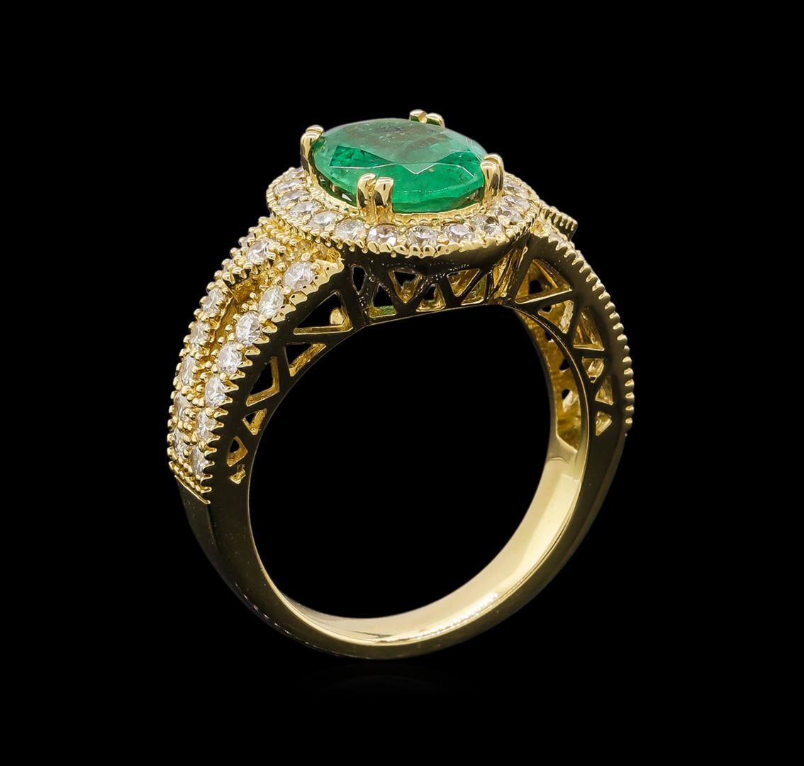 One electronically tested 14KT yellow gold ladies cast emerald and diamond ring with a bright polish finish. Identified with markings of "14K". Condition is new. Containing: One prong set oval modified brilliant cut natural emerald, measuring 10.10 x 8.00 x 4.30mm, approximate weight of 1.98ct., clarity is slightly included, type III, medium light, very slightly grayish, green color, (GIA G 4/3), cut is good. Fifty-Two prong set round brilliant cut diamonds, measuring 1.50 - 1.50 x 0.90mm (depth est.) approximate total weight of 52 Stones = 0.64ct. Clarity: SI-2 to I-1. Color: J - K, Cut is Good. Colored gemstones are presumed to have been subjected to commonly used enhancement processes. All diamonds and colored gemstones are graded in the mounting, unless otherwise stated. Total Weight of Colored Stones 1.98ct. Total Weight of Diamonds 0.64ct. Total Weight of Ring 7.00 grams. GGL Appraised at $4,185.00.
