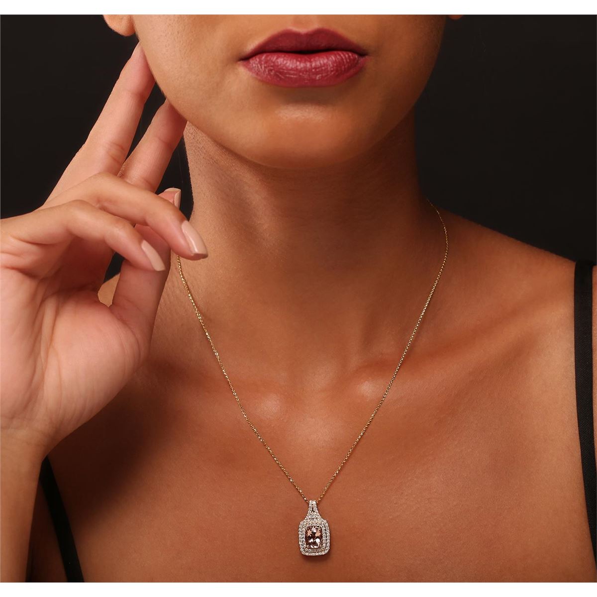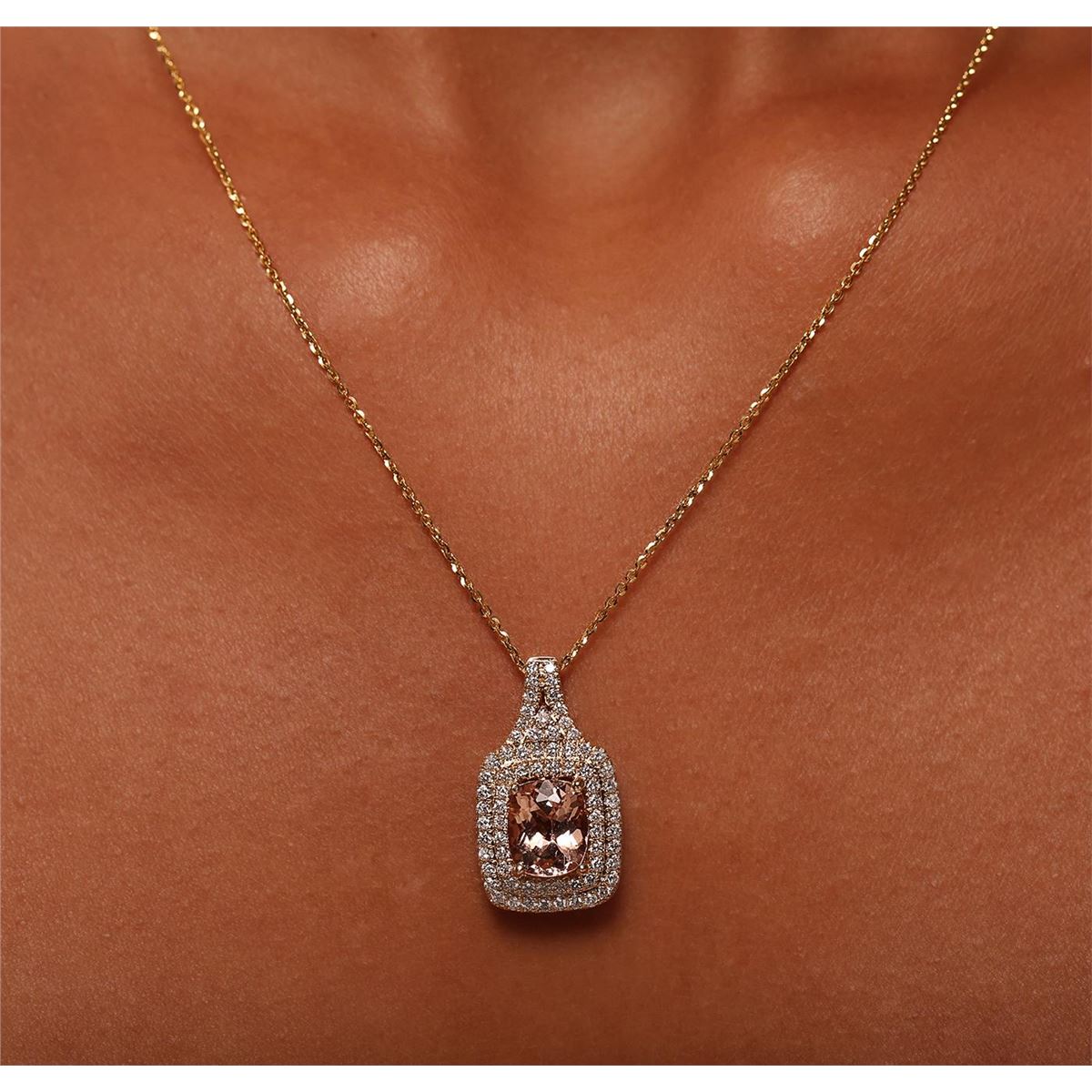 One electronically tested 14KT yellow gold Ladies combination cast & assembled pendant with a bright polish finish. Condition is new. Identified with markings of "14K". Containing: One prong set rectangular cushion modified brilliant cut natural morganite, measuring 8.70 x 7.15 x 5.20mm, exact weight 1.99ct., clarity is eye clean, type I, light, brownish, reddish orange color, (GIA rO 3/1), cut is very good. Colored gemstones are presumed to have been subjected to commonly used color/clarity enhancement processes. Three bead set round brilliant cut diamonds, measuring 1.30 - 1.30 x 0.78mm (depth est.) approximate. Total Weight of 3 Stones = 0.03ct. Clarity: SI-2 to I-1. Color: G - H, Cut is Good. Sixty-Eight prong set round brilliant cut diamonds, measuring 1.20 - 1.20 x 0.72mm (depth est.) approximate. Total Weight of 68 Stones = 0.70ct. Clarity: SI-2 to I-1. Color: G - H, Cut is Good. Total Weight of Colored Stones 1.99ct. Total Weight of Diamonds 0.73ct. Total Weight of Pendant 5.20 grams. GGL Appraised at $5,400.00.