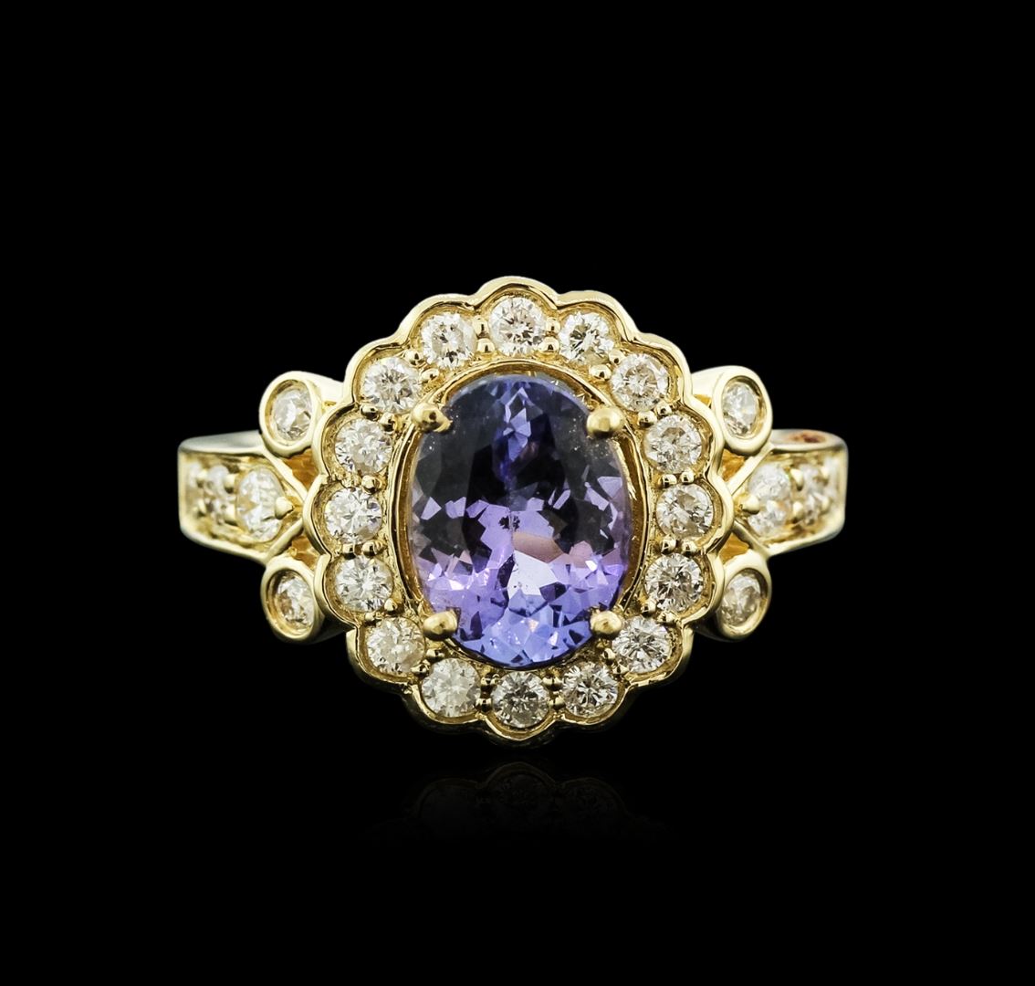 One electronically tested 14KT yellow gold ladies cast tanzanite and diamond ring with a bright and brushed finish. Identified with markings of "14K". Condition is new. Containing: One prong set oval modified brilliant cut natural tanzanite, measuring 9.40 x 6.80 x 4.42mm, approximate weight of 1.99ct., clarity is eye clean, type I, medium light, very slightly grayish, violet color, (GIA V 4/3), cut is good. Twenty-Six prong set round brilliant cut diamonds, measuring 2.40 - 1.90 x 1.29mm (depth est.) approximate total weight of 26 Stones = 0.94ct. Clarity: SI-1 to I-1. Color: I - J. Colored gemstones are presumed to have been subjected to commonly used enhancement processes. All diamonds and colored gemstones are graded in the mounting, unless otherwise stated. Total Weight of Colored Stones 1.99ct. Total Weight of Diamonds 0.94ct. Total Weight of Ring 5.50 grams. GGL Appraised at $4,130.00.