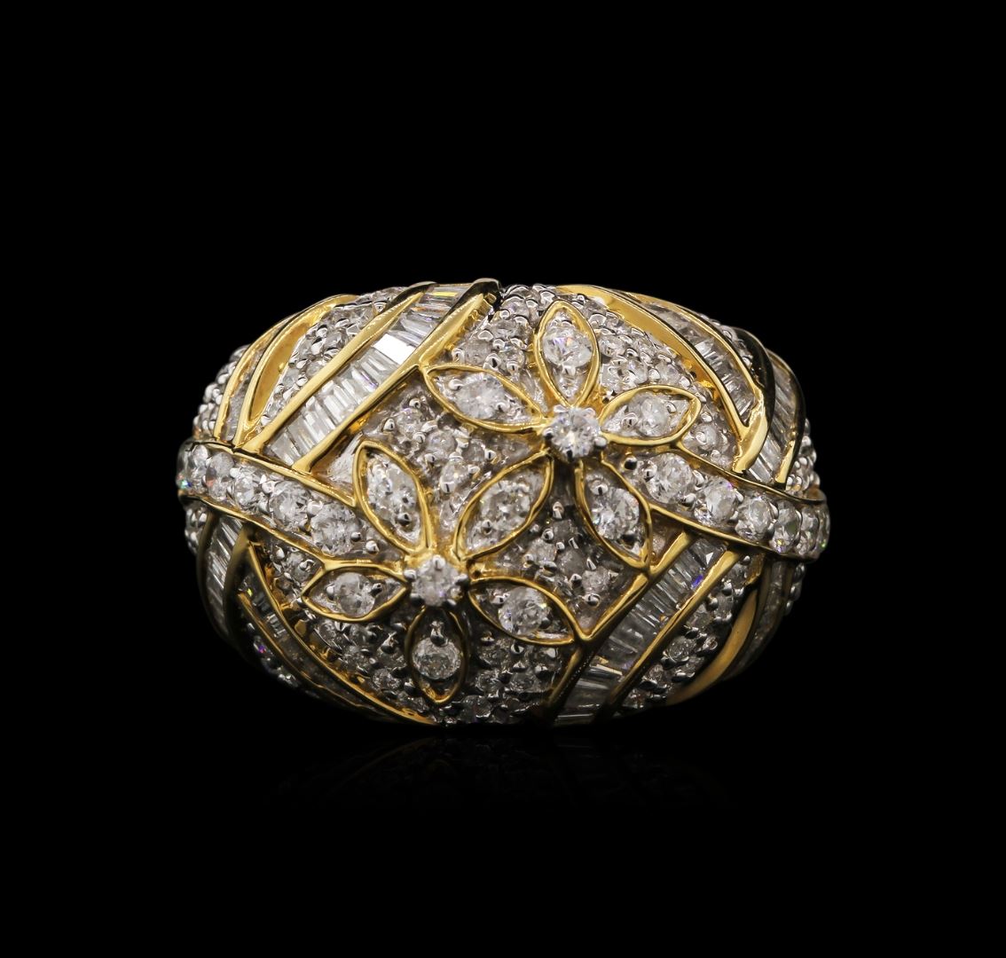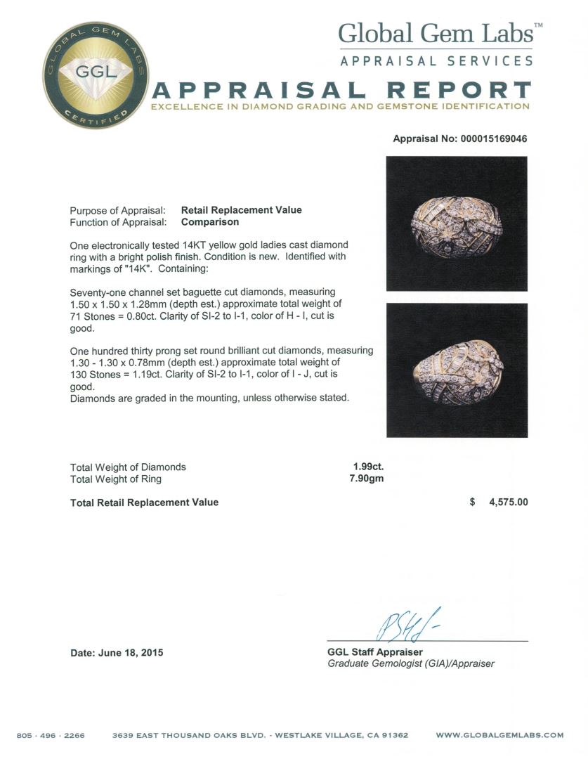 One electronically tested 14KT yellow gold ladies cast diamond ring with a bright polish finish. Identified with markings of "14K". Condition is new. Containing: Seventy-One channel set baguette cut diamonds, measuring 1.50 x 1.50 x 1.28mm (depth est.) approximate total weight of 71 Stones = 0.80ct. Clarity: SI-2 to I-1. Color: H - I, Cut is Good. One Hundred Thirty prong set round brilliant cut diamonds, measuring 1.30 - 1.30 x 0.78mm (depth est.) approximate total weight of 130 Stones = 1.19ct. Clarity: SI-2 to I-1. Color: I - J, Cut is Good. Diamonds are graded in the mounting, unless otherwise stated. Total Weight of Diamonds 1.99ct. Total Weight of Ring 7.90 grams. GGL Appraised at $4,575.00.