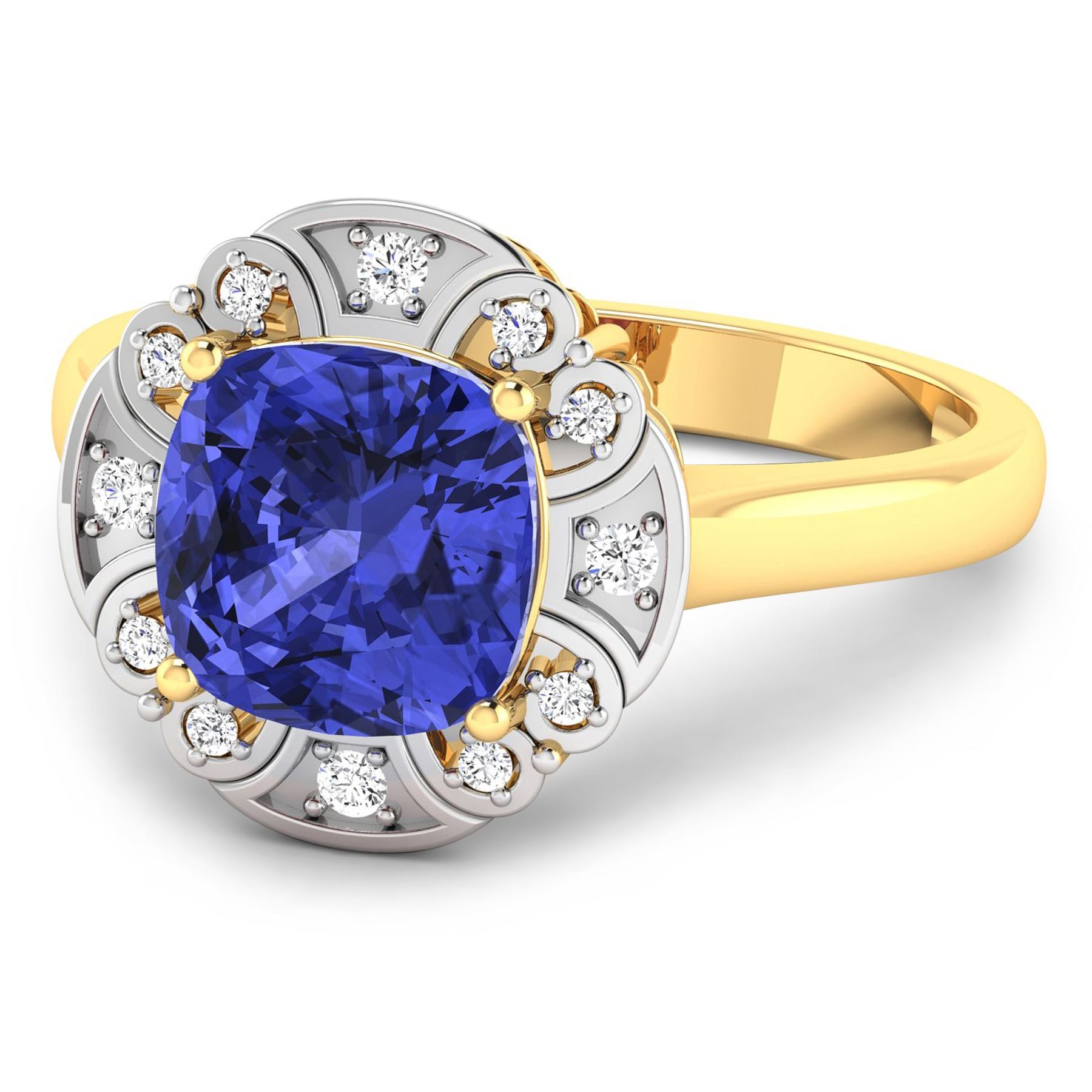 Tanzanite (AA+) Cushion 8.00mm - 1Pc + White Diamond F/C Round 1.50mm - 4Pcs + White Diamond F/C Round 1.00mm - 8Pcs ( White Pan Rhodium ) ( SI-2/HI ) Total weight of gemstone is 1.99cts. Total Diamond weight is 0.09cts. Total weight of this ring is 2.79 grams. Ring size 7.