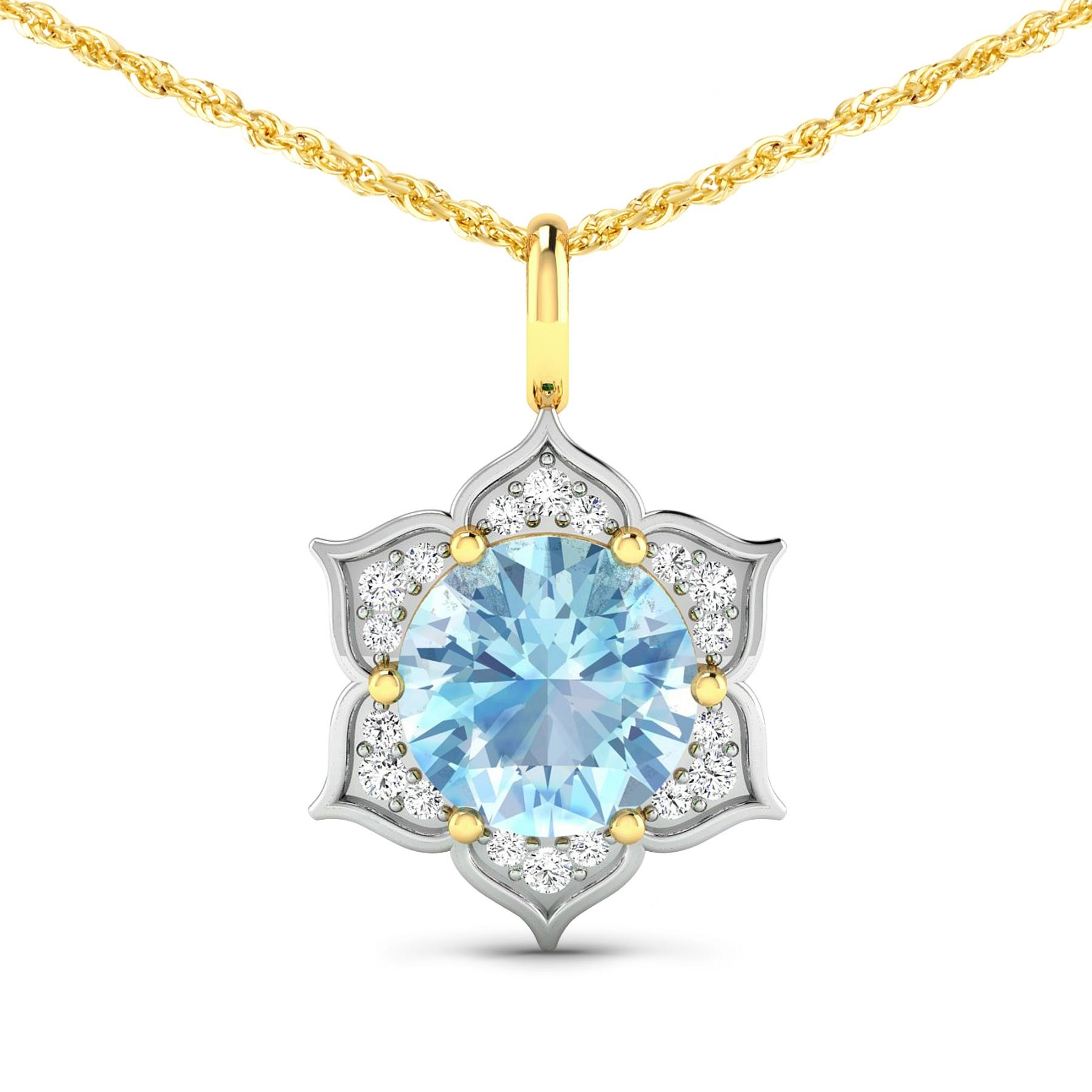Aquamarine (AA+) Round 8.00mm - 1Pc + White Diamond F/C Round 1.30mm - 6Pcs + White Diamond F/C Round 1.10mm - 12Pcs ( White Pan Rhodium ) ( SI2/HI color ) Total weight of gemstone is 1.9cts. Total Diamond weight is 0.14cts. Total weight of this pendant is 2.03 grams.