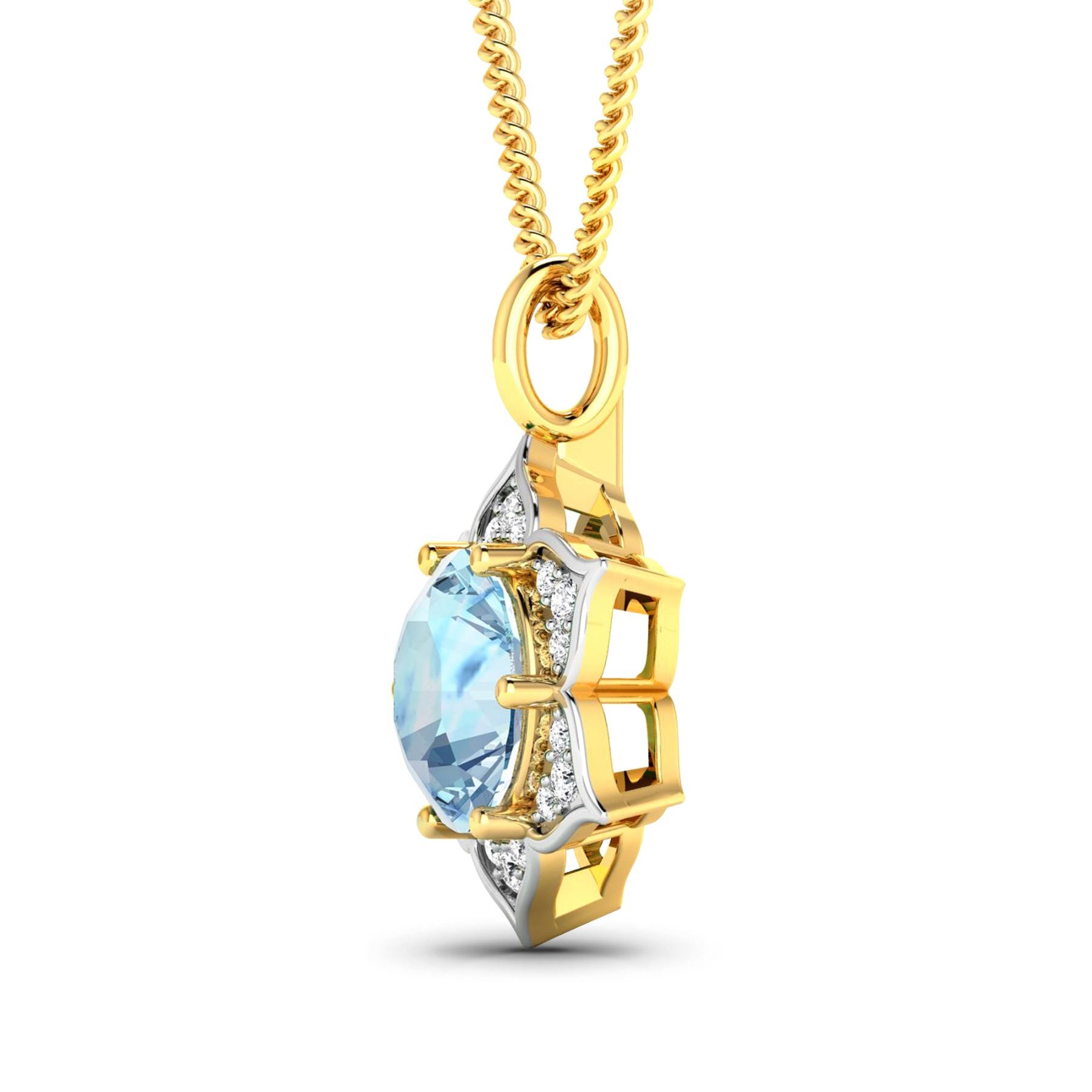 Aquamarine (AA+) Round 8.00mm - 1Pc + White Diamond F/C Round 1.30mm - 6Pcs + White Diamond F/C Round 1.10mm - 12Pcs ( White Pan Rhodium ) ( SI2/HI color ) Total weight of gemstone is 1.9cts. Total Diamond weight is 0.14cts. Total weight of this pendant is 2.03 grams.