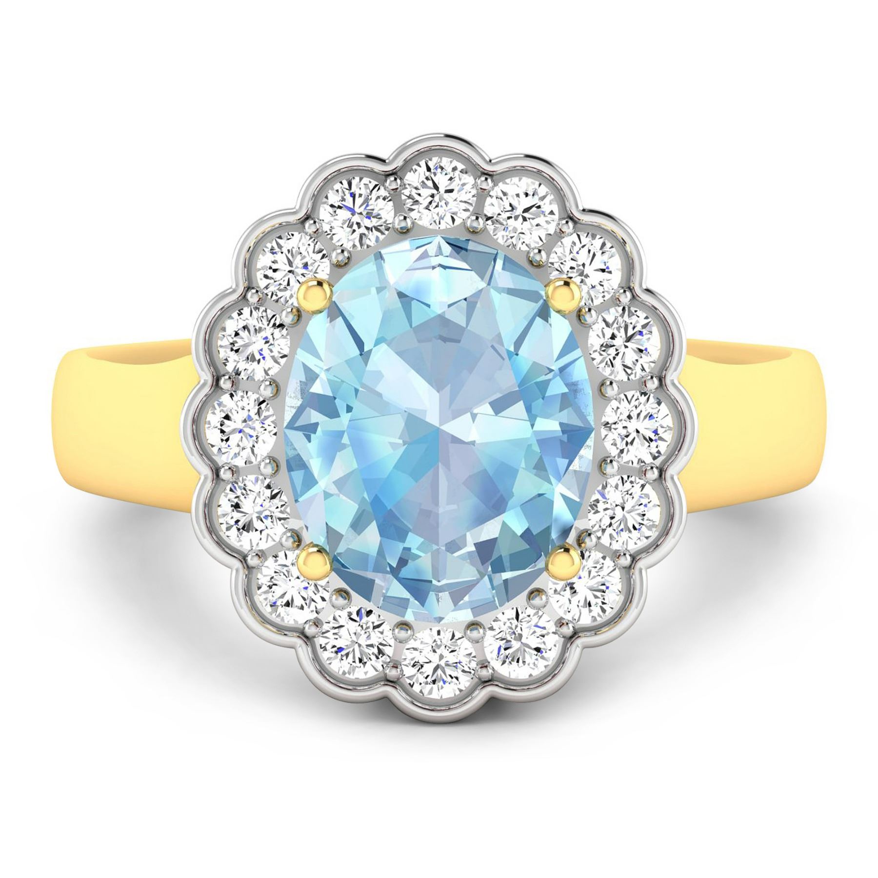 Aquamarine (AA+) Oval 10x8mm - 1Pc + White Diamond F/C Round 2.00mm - 16Pcs ( White Pan Rhodium ) ( SI-2/HI ) Total weight of gemstone is 1.9cts. Total Diamond weight is 0.48cts. Total weight of this ring is 4.1 grams. Ring size 7.
