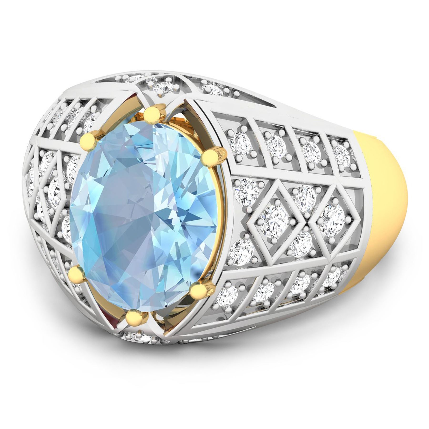 Aquamarine (AA+) Oval 10x8mm - 1Pc + White Diamond F/C Round 1.80mm - 4Pcs + White Diamond F/C Round 1.50mm - 8Pcs + White Diamond F/C Round 1.30mm - 16Pcs + White Diamond F/C Round 1.20mm - 6Pcs ( White Pan Rhodium ) ( SI-2/HI ) Total weight of gemstone is 1.9cts. Total Diamond weight is 0.42cts. Total weight of this ring is 4.53 grams. Ring size 7.