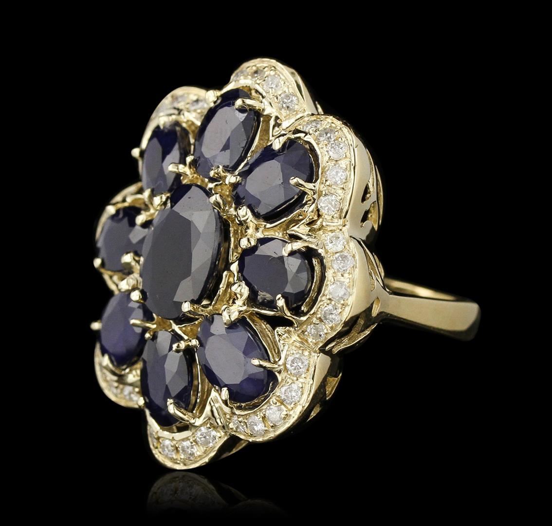 One electronically tested 14KT yellow gold Ladies combination cast & assembled fashion ring with a bright polish finish. Identified with markings of "14K". Condition is excellent. Containing: One prong set oval modified brilliant cut natural blue sapphire, measuring 10.10 x 8.30 x 4.40mm, approximate weight of 2.98ct., clarity is severely included, type II, dark, moderately strong, blue color, (GIA B 7/4), cut is good. Eight prong set oval modified brilliant cut natural blue sapphires, measuring 6.50 x 5.20 x 3.20mm, approximate total weight of 7.04ct., clarity is severely included, type II, dark, moderately strong, blue color, (GIA B 7/4), cut is good. Colored gemstones are presumed to have been subjected to commonly used and possible undetectable color/clarity enhancement processes. Forty prong set round brilliant cut diamonds, measuring 1.50 - 1.50 x 0.90mm (depth est.) approximate total weight of 40 Stones = 0.49ct. Clarity of I-1 to I-2, Color of I - K, Cut is Good. Total Weight of Colored Stones 10.02ct. Total Weight of Diamonds 0.49ct. Total Weight of Ring 13.70gm. GGL Appraised at $9,220.00.