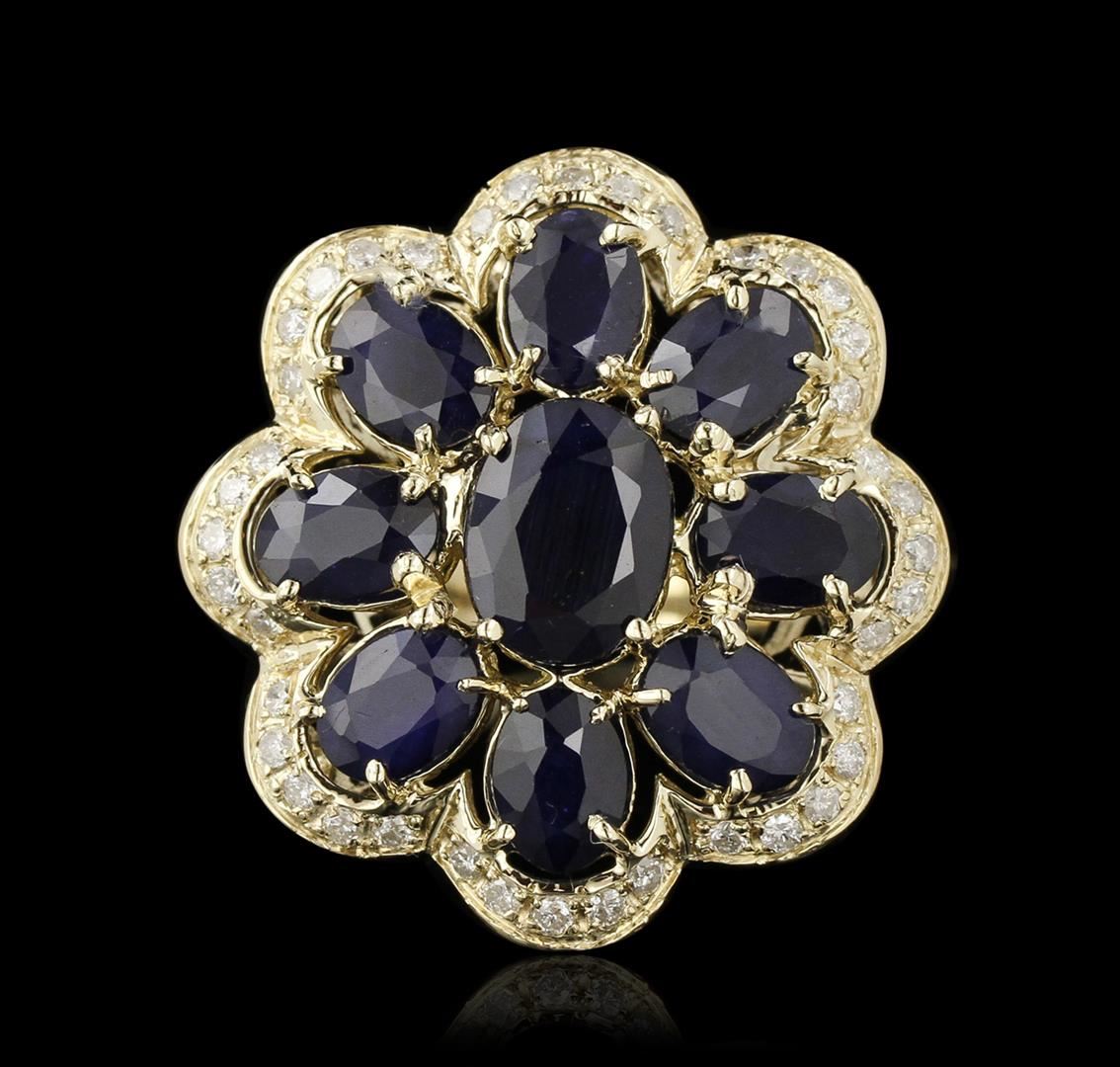 One electronically tested 14KT yellow gold Ladies combination cast & assembled fashion ring with a bright polish finish. Identified with markings of "14K". Condition is excellent. Containing: One prong set oval modified brilliant cut natural blue sapphire, measuring 10.10 x 8.30 x 4.40mm, approximate weight of 2.98ct., clarity is severely included, type II, dark, moderately strong, blue color, (GIA B 7/4), cut is good. Eight prong set oval modified brilliant cut natural blue sapphires, measuring 6.50 x 5.20 x 3.20mm, approximate total weight of 7.04ct., clarity is severely included, type II, dark, moderately strong, blue color, (GIA B 7/4), cut is good. Colored gemstones are presumed to have been subjected to commonly used and possible undetectable color/clarity enhancement processes. Forty prong set round brilliant cut diamonds, measuring 1.50 - 1.50 x 0.90mm (depth est.) approximate total weight of 40 Stones = 0.49ct. Clarity of I-1 to I-2, Color of I - K, Cut is Good. Total Weight of Colored Stones 10.02ct. Total Weight of Diamonds 0.49ct. Total Weight of Ring 13.70gm. GGL Appraised at $9,220.00.