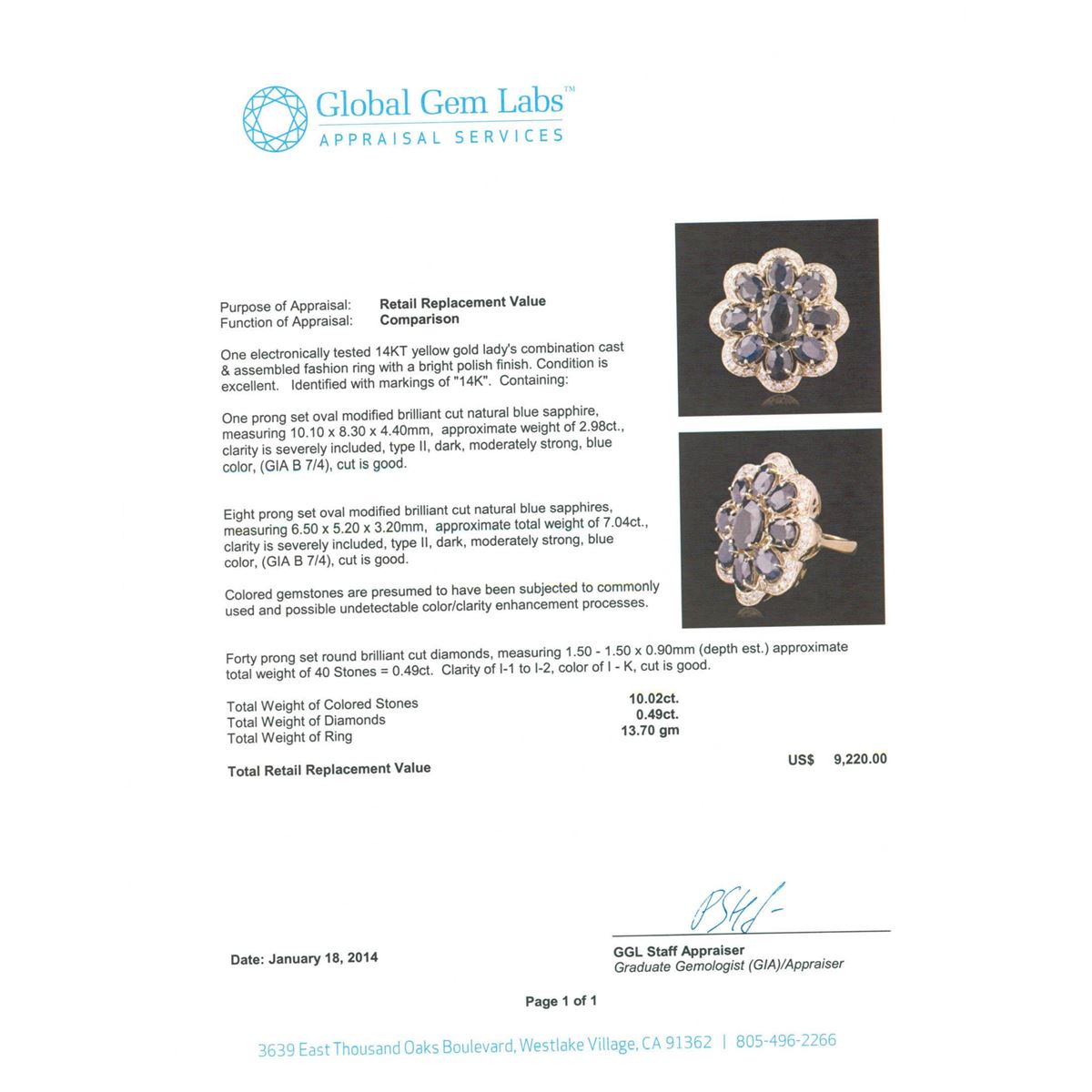 One electronically tested 14KT yellow gold Ladies combination cast & assembled fashion ring with a bright polish finish. Identified with markings of "14K". Condition is excellent. Containing: One prong set oval modified brilliant cut natural blue sapphire, measuring 10.10 x 8.30 x 4.40mm, approximate weight of 2.98ct., clarity is severely included, type II, dark, moderately strong, blue color, (GIA B 7/4), cut is good. Eight prong set oval modified brilliant cut natural blue sapphires, measuring 6.50 x 5.20 x 3.20mm, approximate total weight of 7.04ct., clarity is severely included, type II, dark, moderately strong, blue color, (GIA B 7/4), cut is good. Colored gemstones are presumed to have been subjected to commonly used and possible undetectable color/clarity enhancement processes. Forty prong set round brilliant cut diamonds, measuring 1.50 - 1.50 x 0.90mm (depth est.) approximate total weight of 40 Stones = 0.49ct. Clarity of I-1 to I-2, Color of I - K, Cut is Good. Total Weight of Colored Stones 10.02ct. Total Weight of Diamonds 0.49ct. Total Weight of Ring 13.70gm. GGL Appraised at $9,220.00.