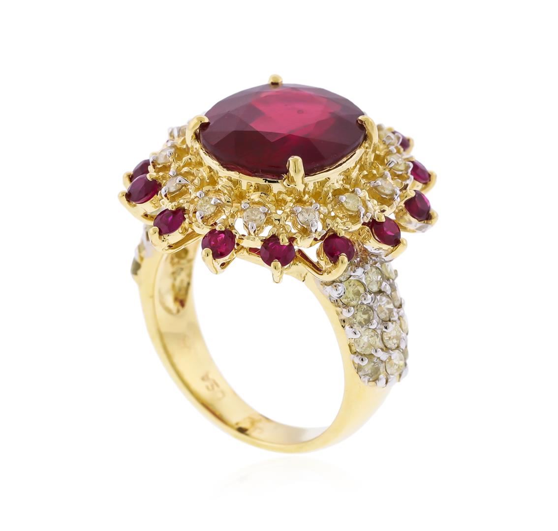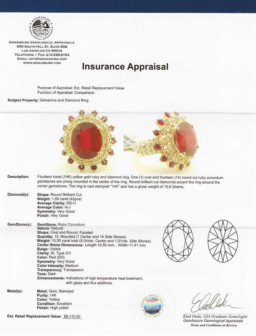 One fourteen karat (14KT) yellow gold ruby and diamond ring. One oval and fourteen round cut ruby corundum gemstones are prong mounted in the center of the ring. Round brilliant cut diamonds, average clarity SI2-I1, average color H-J, weighing 1.09 carats, accent the ring around the center gemstone. The ring is cast stamped "14K" and has a gross weight of 10.8 Grams. GGA Appraised at $8,110.00.