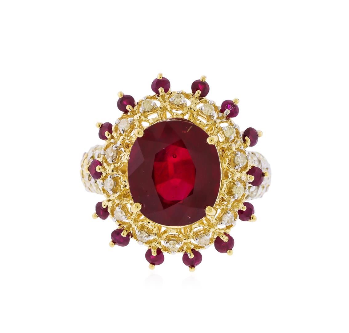 One fourteen karat (14KT) yellow gold ruby and diamond ring. One oval and fourteen round cut ruby corundum gemstones are prong mounted in the center of the ring. Round brilliant cut diamonds, average clarity SI2-I1, average color H-J, weighing 1.09 carats, accent the ring around the center gemstone. The ring is cast stamped "14K" and has a gross weight of 10.8 Grams. GGA Appraised.