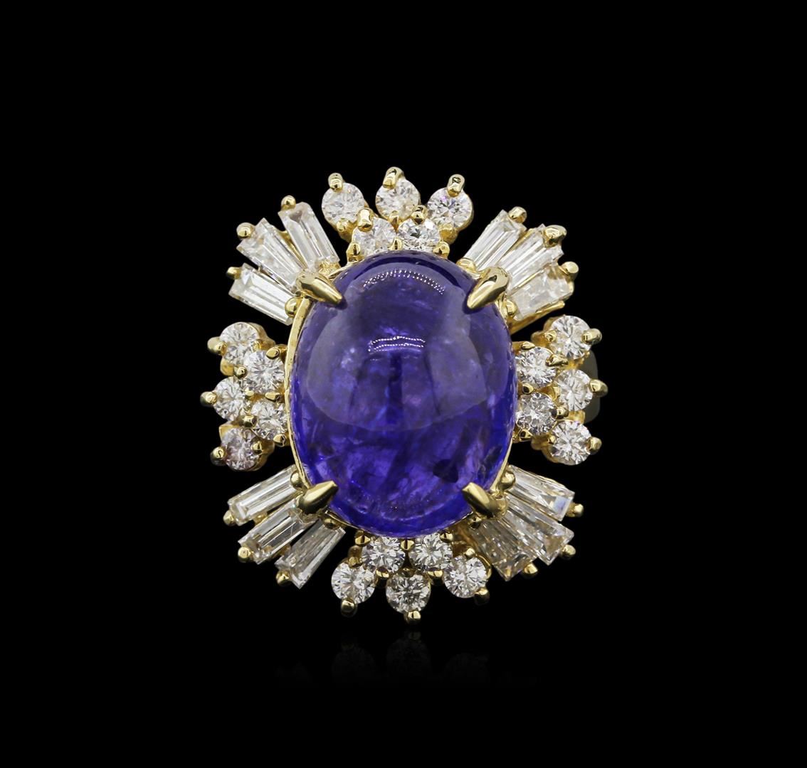 One electronically tested 14KT yellow gold ladies cast tanzanite and diamond ring with a bright polish finish. Identified with markings of "14K". Condition is new. Containing: One prong set oval cabochon cut natural tanzanite, measuring 14.20 x 11.00 x 7.15mm, approximate weight of 10.10ct., clarity is heavily included, type I, medium, moderately strong, violetish blue color, (GIA vB 5/4), cut is good. Twenty prong set round brilliant cut diamonds, measuring 2.00 - 2.00 x 1.20mm (depth est.) approximate total weight of 20 Stones = 0.58ct. Clarity: I-1 to I-2. Color: H - I, Cut is Good. Twelve prong set baguette cut diamonds, measuring from 4.00 x 1.50 x 1.28mm (depth est.) to 4.20 x 1.50 x 1.28mm (depth est.) approximate total weight of 12 Stones = 0.86ct. Clarity: VS-2. Color: I - J, Cut is Good. Diamonds and colored gemstones are graded in the mounting, unless otherwise stated. Colored gemstones are presumed to have been subjected to commonly used enhancement processes. Total Weight of Colored Stones 10.10ct. Total Weight of Diamonds 1.45ct. Total Weight of Ring 9.60 grams. GGL Appraised at $6,645.00.