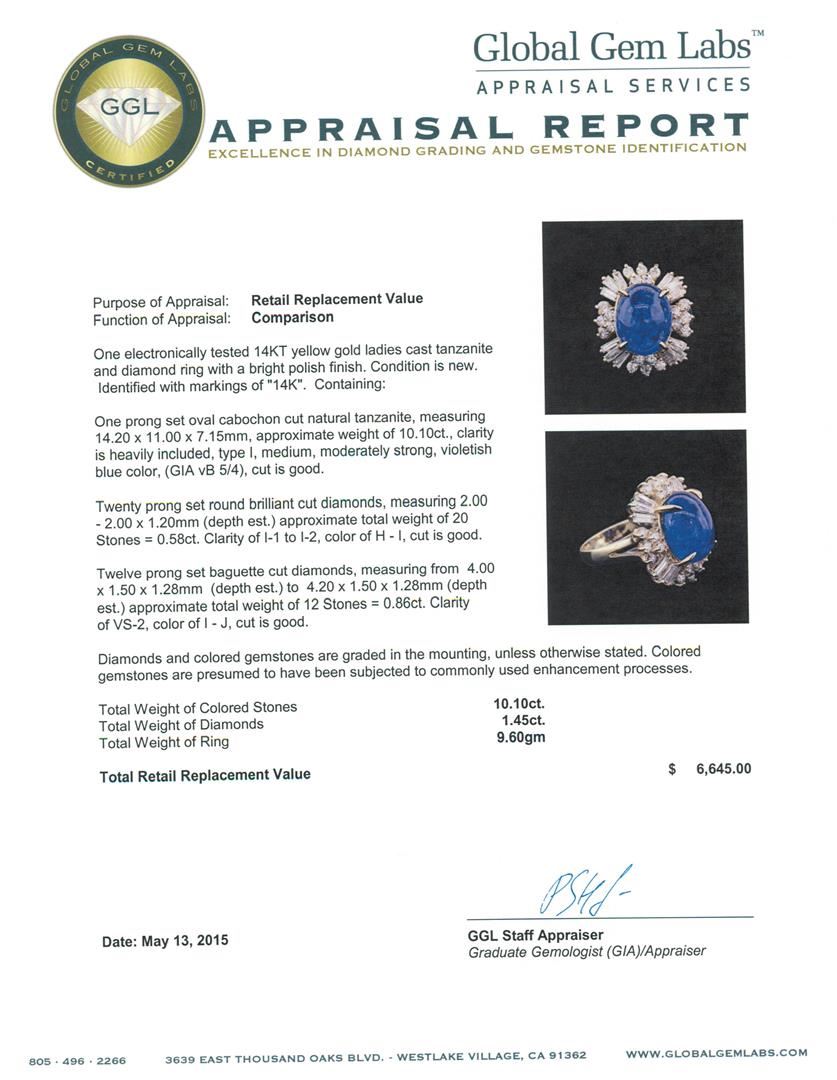 One electronically tested 14KT yellow gold ladies cast tanzanite and diamond ring with a bright polish finish. Identified with markings of "14K". Condition is new. Containing: One prong set oval cabochon cut natural tanzanite, measuring 14.20 x 11.00 x 7.15mm, approximate weight of 10.10ct., clarity is heavily included, type I, medium, moderately strong, violetish blue color, (GIA vB 5/4), cut is good. Twenty prong set round brilliant cut diamonds, measuring 2.00 - 2.00 x 1.20mm (depth est.) approximate total weight of 20 Stones = 0.58ct. Clarity: I-1 to I-2. Color: H - I, Cut is Good. Twelve prong set baguette cut diamonds, measuring from 4.00 x 1.50 x 1.28mm (depth est.) to 4.20 x 1.50 x 1.28mm (depth est.) approximate total weight of 12 Stones = 0.86ct. Clarity: VS-2. Color: I - J, Cut is Good. Diamonds and colored gemstones are graded in the mounting, unless otherwise stated. Colored gemstones are presumed to have been subjected to commonly used enhancement processes. Total Weight of Colored Stones 10.10ct. Total Weight of Diamonds 1.45ct. Total Weight of Ring 9.60 grams. GGL Appraised at $6,645.00.
