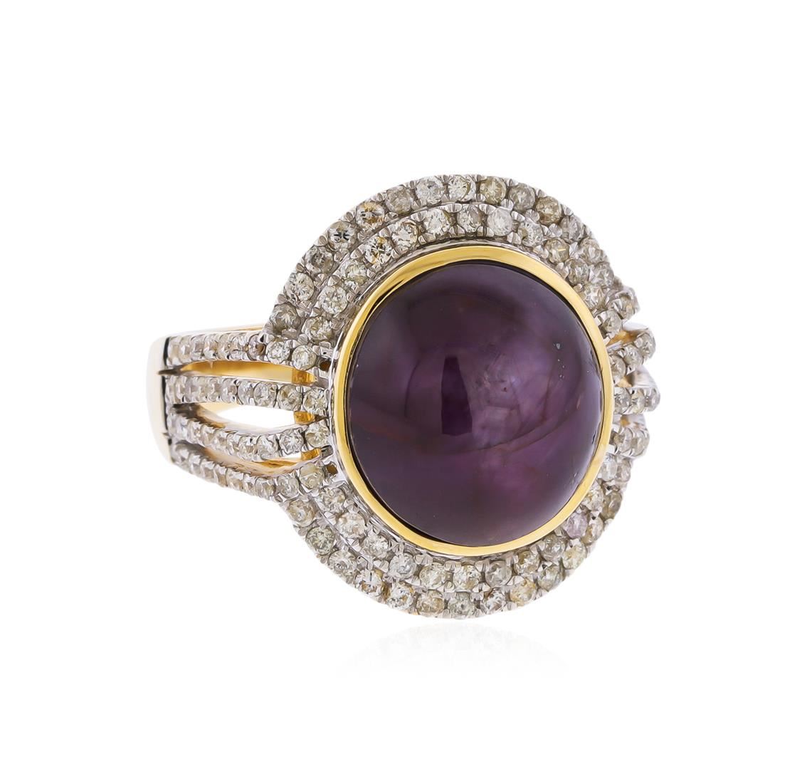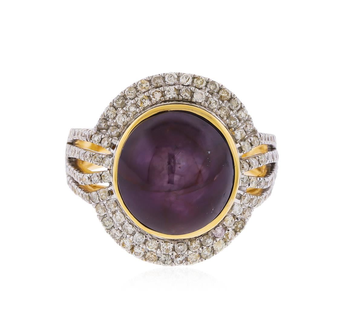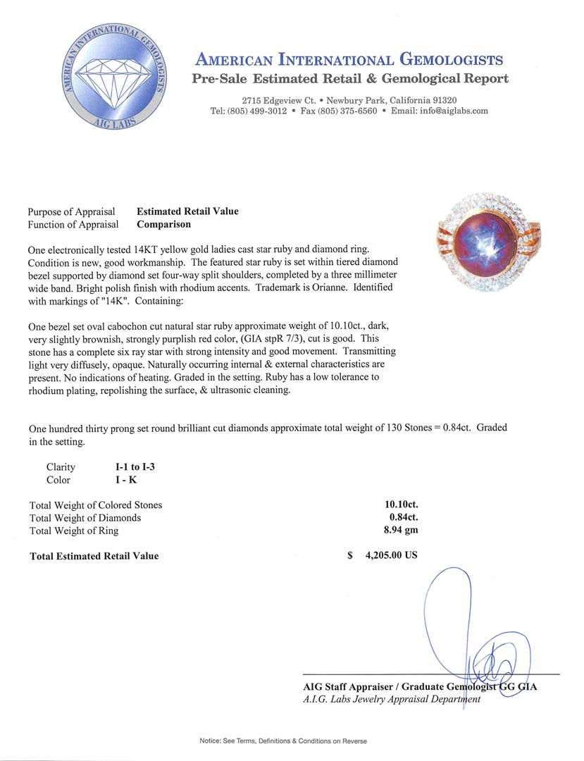 One electronically tested 14KT yellow gold ladies cast star ruby and diamond ring. The featured star ruby is set within tiered diamond bezel supported by diamond set four-way split shoulders, completed by a three millimeter wide band. Bright polish finish with rhodium accents. Trademark is Orianne. Identified with markings of "14K". Condition is new, good workmanship. Containing: One bezel set oval cabochon cut natural star ruby approximate weight of 10.10ct., dark, very slightly brownish, strongly purplish red color, (GIA stpR 7/3), cut is good. This stone has a complete six ray star with strong intensity and good movement. Transmitting light very diffusely, opaque. Naturally occurring internal & external characteristics arepresent. No indications of heating. Graded in the setting. Ruby has a low tolerance torhodium plating, repolishing the surface, & ultrasonic cleaning.One Hundred Thirty prong set round brilliant cut diamonds approximate total weight of 130 Stones = 0.84ct. Graded in the setting. Clarity: I-1 to I-3. Color: I - K. Total Weight of Colored Stones 10.10ct. Total Weight of Diamonds 0.84ct. Total Weight of Ring 8.94gm. AIG Appraised at $4,205.00.