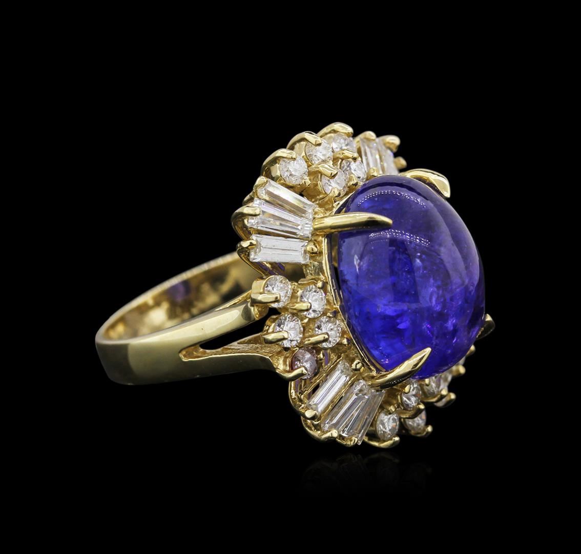 One electronically tested 14KT yellow gold ladies cast tanzanite and diamond ring with a bright polish finish. Identified with markings of "14K". Condition is new. Containing: One prong set oval cabochon cut natural tanzanite, measuring 14.20 x 11.00 x 7.15mm, approximate weight of 10.10ct., clarity is heavily included, type I, medium, moderately strong, violetish blue color, (GIA vB 5/4), cut is good. Twenty prong set round brilliant cut diamonds, measuring 2.00 - 2.00 x 1.20mm (depth est.) approximate total weight of 20 Stones = 0.58ct. Clarity: I-1 to I-2. Color: H - I, Cut is Good. Twelve prong set baguette cut diamonds, measuring from 4.00 x 1.50 x 1.28mm (depth est.) to 4.20 x 1.50 x 1.28mm (depth est.) approximate total weight of 12 Stones = 0.86ct. Clarity: VS-2. Color: I - J, Cut is Good. Diamonds and colored gemstones are graded in the mounting, unless otherwise stated. Colored gemstones are presumed to have been subjected to commonly used enhancement processes. Total Weight of Colored Stones 10.10ct. Total Weight of Diamonds 1.45ct. Total Weight of Ring 9.60 grams. GGL Appraised at $6,645.00.