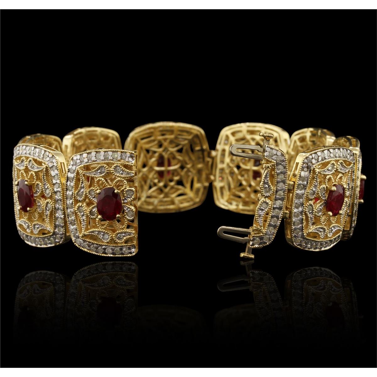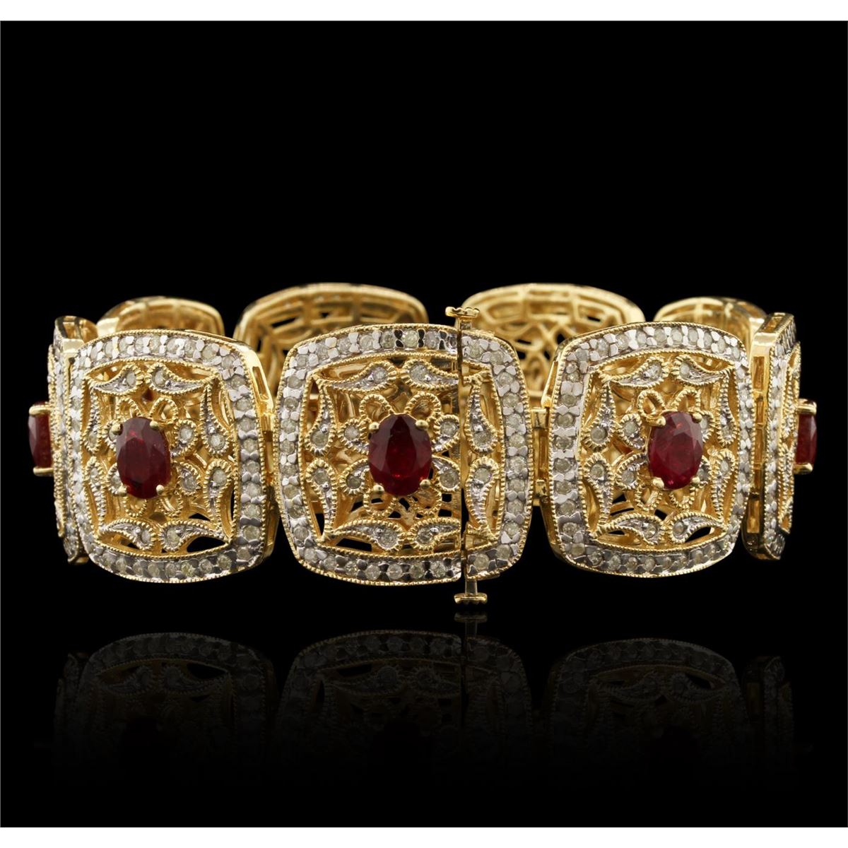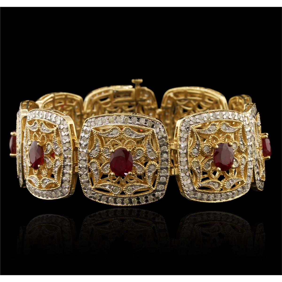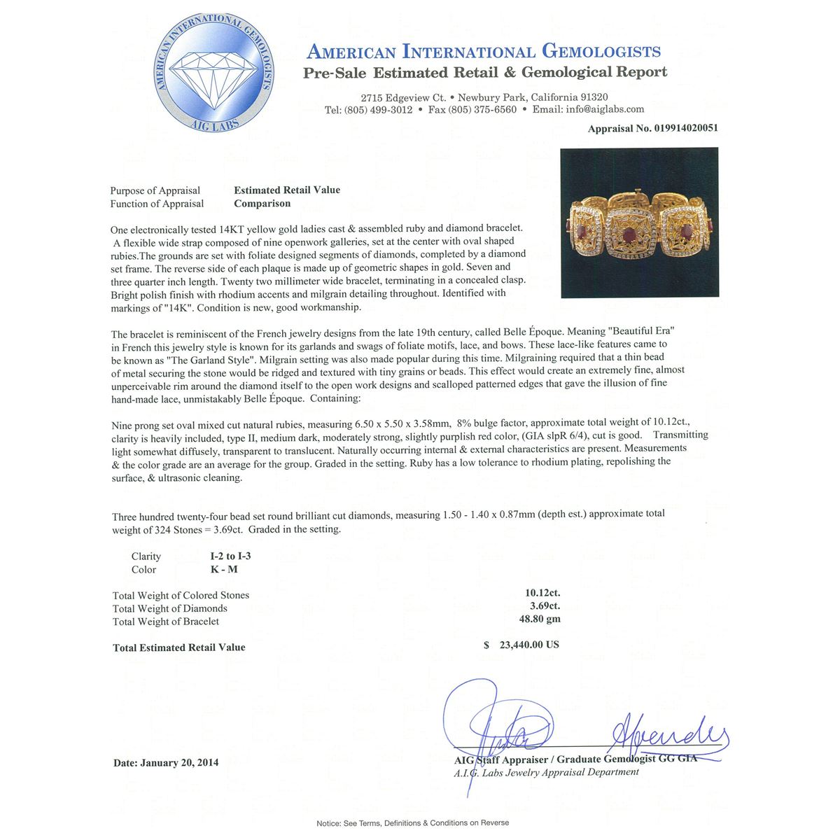 One electronically tested 14KT yellow gold ladies cast & assembled ruby and diamond bracelet. A flexible wide strap composed of nine openwork galleries, set at the center with oval shaped rubies. The grounds are set with foliate designed segments of diamonds, completed by a diamond set frame. The reverse side of each plaque is made up of geometric shapes in gold. Seven and three quarter inch length. Twenty two millimeter wide bracelet, terminating in a concealed clasp. Bright polish finish with rhodium accents and milgrain detailing throughout. Identified with markings of "14K". Condition is new, good workmanship. The bracelet is reminiscent of the French jewelry designs from the late 19th century, called Belle poque. Meaning "Beautiful Era" in French this jewelry style is known for its garlands and swags of foliate motifs, lace, and bows. These lace-like features came to be known as "The Garland Style". Milgrain setting was also made popular during this time. Milgraining required that a thin bead of metal securing the stone would be ridged and textured with tiny grains or beads. This effect would create an extremely fine, almost unperceivable rim around the diamond itself to the open work designs and scalloped patterned edges that gave the illusion of fine hand-made lace, unmistakably Belle poque. Containing: Nine prong set oval mixed cut natural rubies, measuring 6.50 x 5.50 x 3.58mm, 8%. bulge factor, approximate. Total Weight of 10.12ct., clarity is heavily included, type II, medium dark, moderately strong, slightly purplish red color, (GIA slpR 6/4), cut is good. Transmitting light somewhat diffusely, transparent to translucent. Naturally occurring internal & external characteristics are present. Measurements & the color grade are an average for the group. Graded in the setting. Ruby has a low tolerance to rhodium plating, repolishing the surface, & ultrasonic cleaning. Three Hundred Twenty-Four bead set round brilliant cut diamonds, measuring 1.50 - 1.40 x 0.87mm (depth est.) approximate. Total Weight of 324 Stones = 3.69ct. Graded in the setting. Clarity: I-2 to I-3. Color: K - M. Total Weight of Colored Stones 10.12ct. Total Weight of Diamonds 3.69ct. Total Weight of Bracelet 48.80gm. AIG Appraised at $23,440.00.