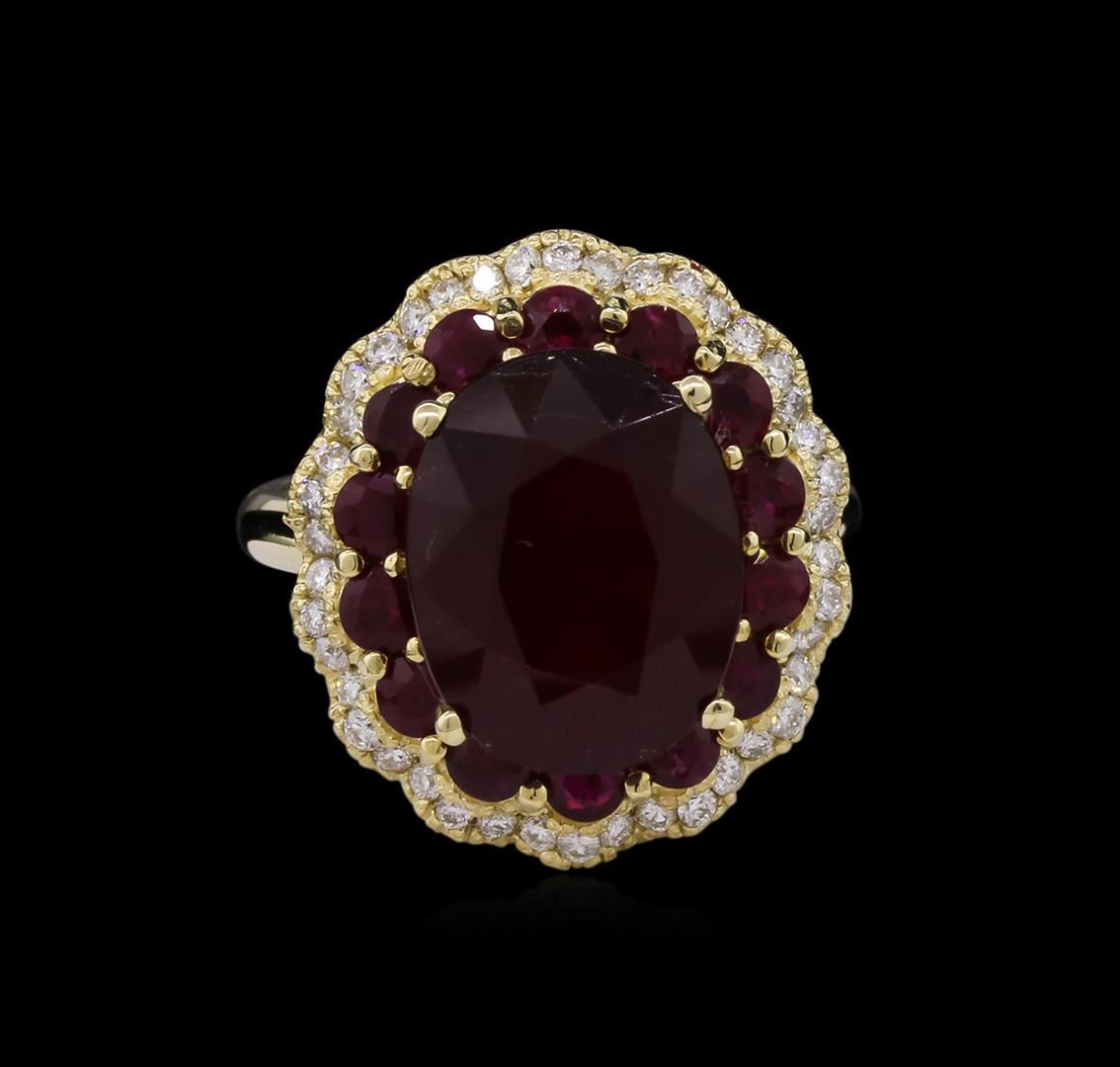 One electronically tested 14KT yellow gold ladies cast ruby and diamond ring with a bright polish finish. Identified with markings of "K14". Condition is new. Containing: One prong set oval modified brilliant cut natural ruby, measuring 13.40 x 10.50 x 6.83mm, approximate weight of 8.17ct., clarity is heavily included, type II, medium dark, moderately strong, strongly purplish red color, (GIA stpR 6/4), cut is good. Fourteen prong set round modified brilliant cut natural rubies, measuring 3.00 - 3.00 x 1.95 mm, approximate total weight of 1.96ct., clarity is heavily included, type II, medium dark, moderately strong, strongly purplish red color, (GIA stpR 6/4), cut is good. Forty-Two prong set round brilliant cut diamonds, measuring 1.30 - 1.30 x 0.78mm (depth est.) approximate total weight of 42 Stones = 0.34ct. Clarity: SI-1 to I-1. Color: I - J, Cut is Good. Colored gemstones are presumed to have been subjected to commonly used enhancement processes. All diamonds and colored gemstones are graded in the mounting, unless otherwise stated. Total Weight of Colored Stones 10.13ct. Total Weight of Diamonds 0.34ct. Total Weight of Ring 9.40 grams. GGL Appraised at $4,670.00.