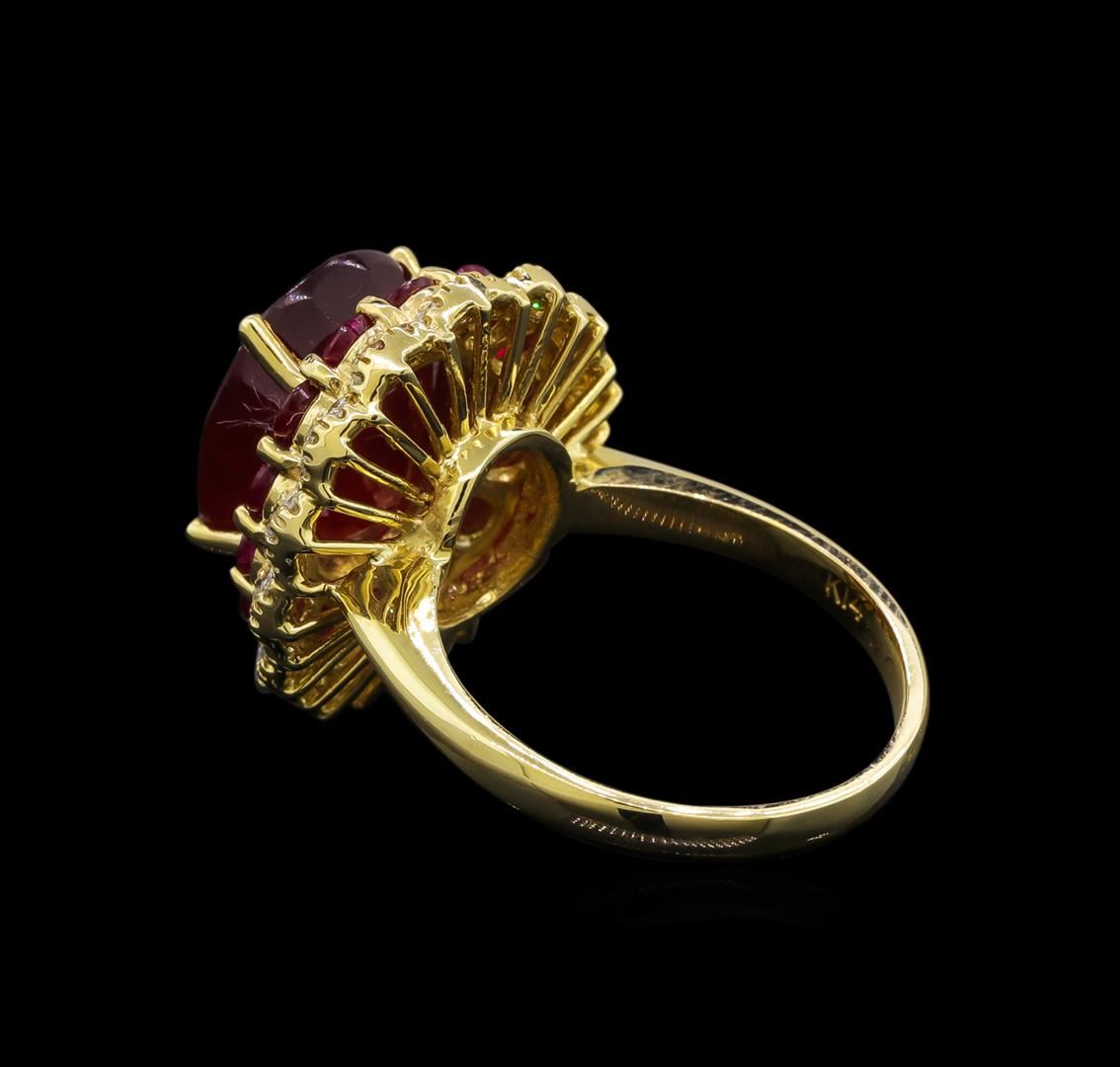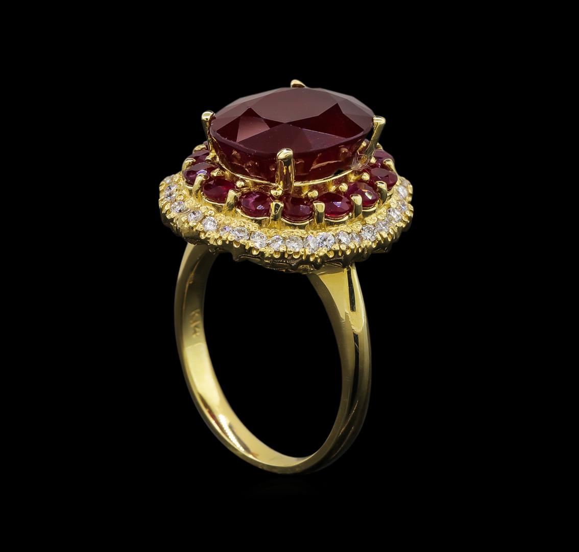 One electronically tested 14KT yellow gold ladies cast ruby and diamond ring with a bright polish finish. Identified with markings of "K14". Condition is new. Containing: One prong set oval modified brilliant cut natural ruby, measuring 13.40 x 10.50 x 6.83mm, approximate weight of 8.17ct., clarity is heavily included, type II, medium dark, moderately strong, strongly purplish red color, (GIA stpR 6/4), cut is good. Fourteen prong set round modified brilliant cut natural rubies, measuring 3.00 - 3.00 x 1.95 mm, approximate total weight of 1.96ct., clarity is heavily included, type II, medium dark, moderately strong, strongly purplish red color, (GIA stpR 6/4), cut is good. Forty-Two prong set round brilliant cut diamonds, measuring 1.30 - 1.30 x 0.78mm (depth est.) approximate total weight of 42 Stones = 0.34ct. Clarity: SI-1 to I-1. Color: I - J, Cut is Good. Colored gemstones are presumed to have been subjected to commonly used enhancement processes. All diamonds and colored gemstones are graded in the mounting, unless otherwise stated. Total Weight of Colored Stones 10.13ct. Total Weight of Diamonds 0.34ct. Total Weight of Ring 9.40 grams. GGL Appraised at $4,670.00.