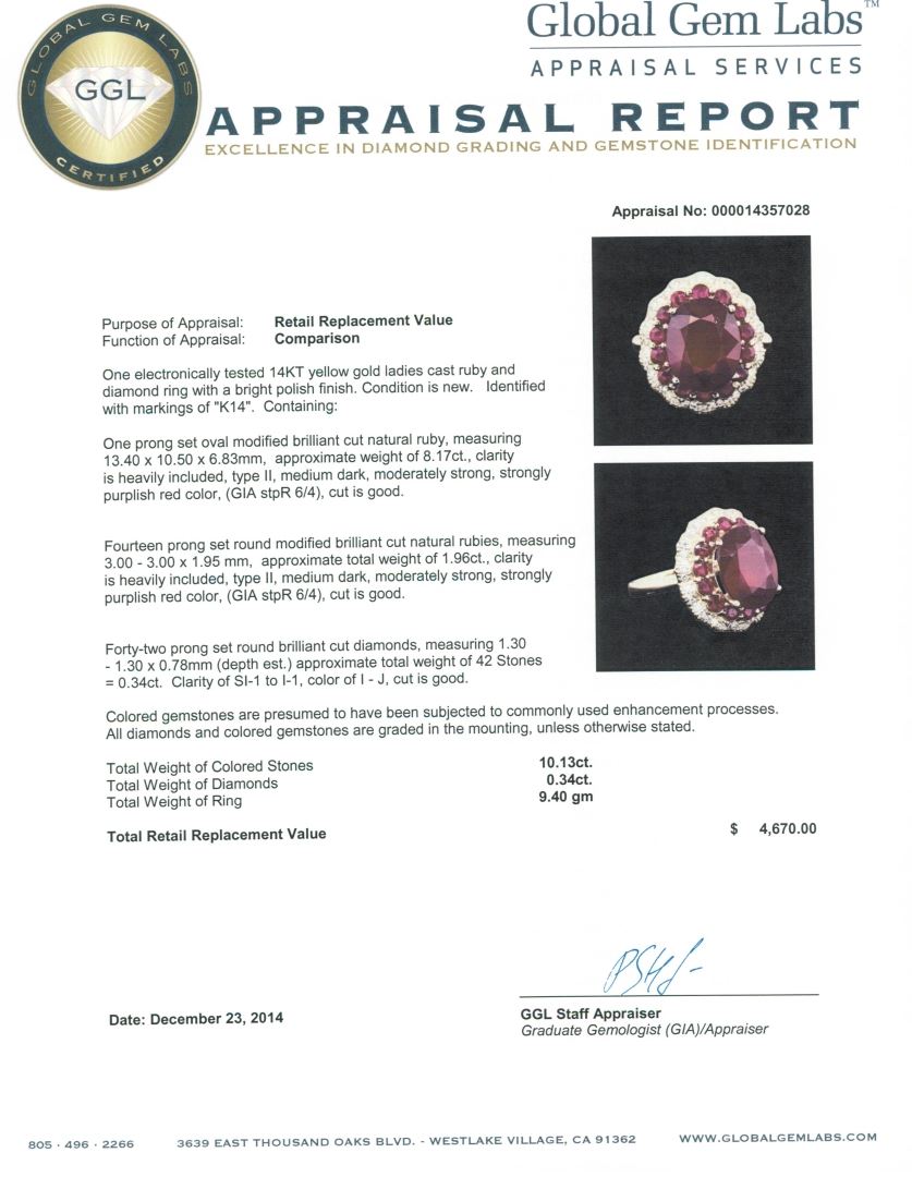 One electronically tested 14KT yellow gold ladies cast ruby and diamond ring with a bright polish finish. Identified with markings of "K14". Condition is new. Containing: One prong set oval modified brilliant cut natural ruby, measuring 13.40 x 10.50 x 6.83mm, approximate weight of 8.17ct., clarity is heavily included, type II, medium dark, moderately strong, strongly purplish red color, (GIA stpR 6/4), cut is good. Fourteen prong set round modified brilliant cut natural rubies, measuring 3.00 - 3.00 x 1.95 mm, approximate total weight of 1.96ct., clarity is heavily included, type II, medium dark, moderately strong, strongly purplish red color, (GIA stpR 6/4), cut is good. Forty-Two prong set round brilliant cut diamonds, measuring 1.30 - 1.30 x 0.78mm (depth est.) approximate total weight of 42 Stones = 0.34ct. Clarity: SI-1 to I-1. Color: I - J, Cut is Good. Colored gemstones are presumed to have been subjected to commonly used enhancement processes. All diamonds and colored gemstones are graded in the mounting, unless otherwise stated. Total Weight of Colored Stones 10.13ct. Total Weight of Diamonds 0.34ct. Total Weight of Ring 9.40 grams. GGL Appraised at $4,670.00.