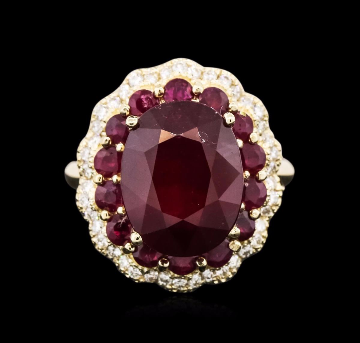One electronically tested 14KT yellow gold ladies cast ruby and diamond ring with a bright polish finish. Identified with markings of "K14". Condition is new. Containing: One prong set oval modified brilliant cut natural ruby, measuring 13.40 x 10.50 x 6.83mm, approximate weight of 8.17ct., clarity is heavily included, type II, medium dark, moderately strong, strongly purplish red color, (GIA stpR 6/4), cut is good. Fourteen prong set round modified brilliant cut natural rubies, measuring 3.00 - 3.00 x 1.95 mm, approximate total weight of 1.96ct., clarity is heavily included, type II, medium dark, moderately strong, strongly purplish red color, (GIA stpR 6/4), cut is good. Forty-Two prong set round brilliant cut diamonds, measuring 1.30 - 1.30 x 0.78mm (depth est.) approximate total weight of 42 Stones = 0.34ct. Clarity: SI-1 to I-1. Color: I - J, Cut is Good. Colored gemstones are presumed to have been subjected to commonly used enhancement processes. All diamonds and colored gemstones are graded in the mounting, unless otherwise stated. Total Weight of Colored Stones 10.13ct. Total Weight of Diamonds 0.34ct. Total Weight of Ring 9.40 grams. GGL Appraised at $4,670.00.