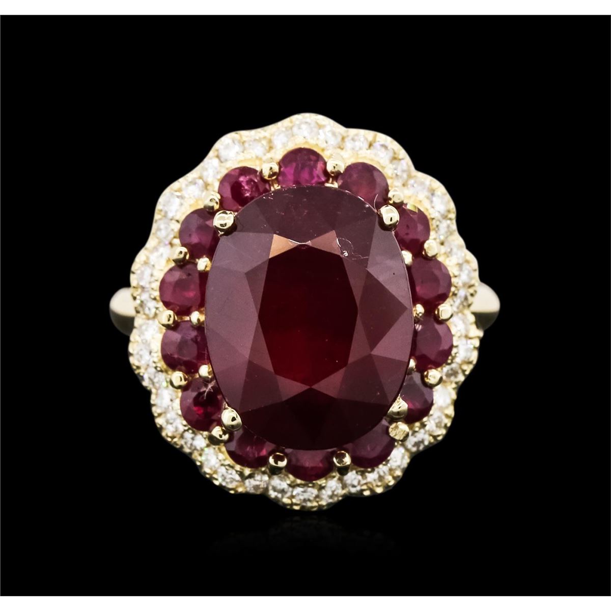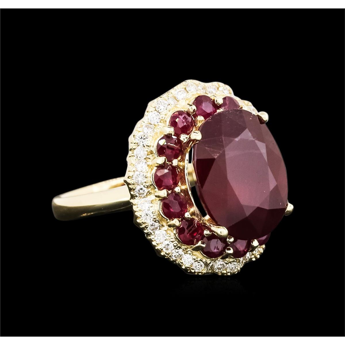 One electronically tested 14KT yellow gold ladies cast ruby and diamond ring with a bright polish finish. Identified with markings of "K14". Condition is new. Containing: One prong set oval modified brilliant cut natural ruby, measuring 13.40 x 10.50 x 6.83mm, approximate weight of 8.17ct., clarity is heavily included, type II, medium dark, moderately strong, strongly purplish red color, (GIA stpR 6/4), cut is good. Fourteen prong set round modified brilliant cut natural rubies, measuring 3.00 - 3.00 x 1.95 mm, approximate total weight of 1.96ct., clarity is heavily included, type II, medium dark, moderately strong, strongly purplish red color, (GIA stpR 6/4), cut is good. Forty-Two prong set round brilliant cut diamonds, measuring 1.30 - 1.30 x 0.78mm (depth est.) approximate total weight of 42 Stones = 0.34ct. Clarity: SI-1 to I-1. Color: I - J, Cut is Good. Colored gemstones are presumed to have been subjected to commonly used enhancement processes. All diamonds and colored gemstones are graded in the mounting, unless otherwise stated. Total Weight of Colored Stones 10.13ct. Total Weight of Diamonds 0.34ct. Total Weight of Ring 9.40 grams. GGL Appraised at $4,670.00.
