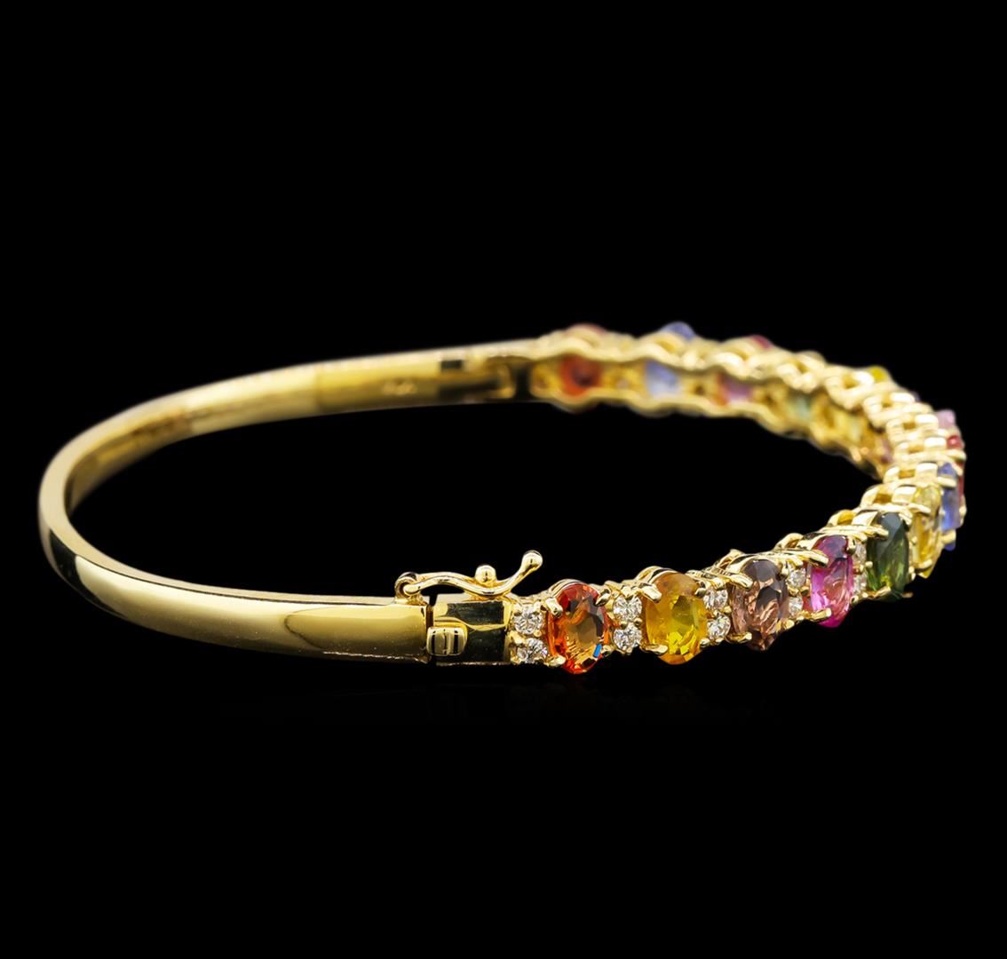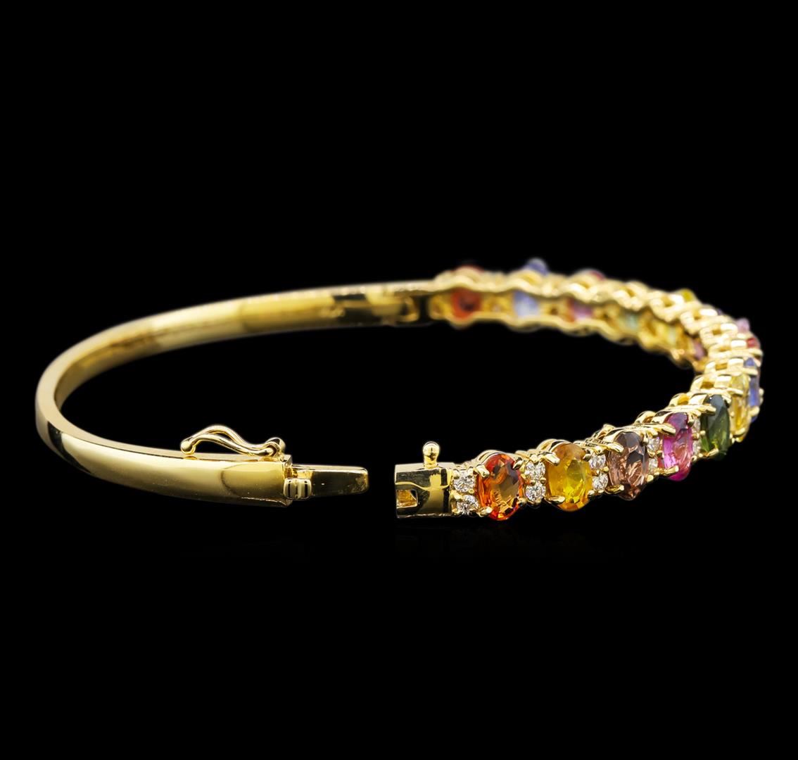 One electronically tested 14KT yellow gold ladies cast sapphire and diamond bangle bracelet with a hidden box clasp with safety closer with a bright polish finish. Identified with markings of "14K". Condition is new. Containing: Fifteen prong set oval modified brilliant cut natural multicolor sapphires, measuring 6.50 x 4.50 x 2.93mm, approximate total weight of 10.15ct., clarity is slightly included, type II, light, slightly grayish, green, yellow, orange, purple, and blue color, (GIA V 3/2), cut is good. Thirty-Two prong set round brilliant cut diamonds, measuring 1.80 - 1.80 x 1.08mm (depth est.) approximate total weight of 32 Stones = 0.73ct. Clarity: SI-1 to I-1. Color: J, Cut is Good. Colored gemstones are presumed to have been subjected to commonly used enhancement processes. All diamonds and colored gemstones are graded in the mounting, unless otherwise stated. Total Weight of Colored Stones 10.15ct. Total Weight of Diamonds 0.73ct. Total Weight of Bangle Bracelet 18.50 grams. GGL Appraised at $4,935.00.