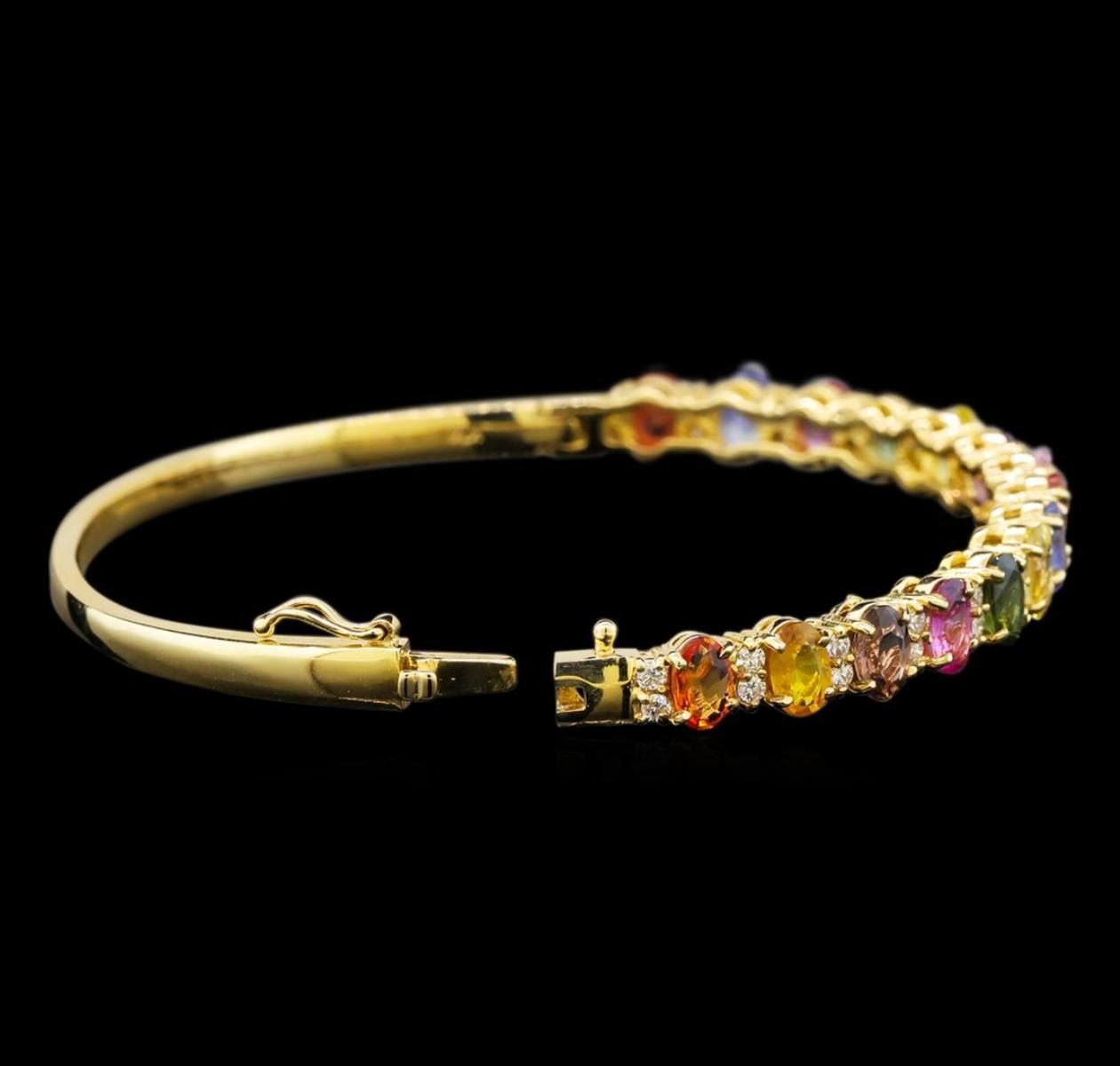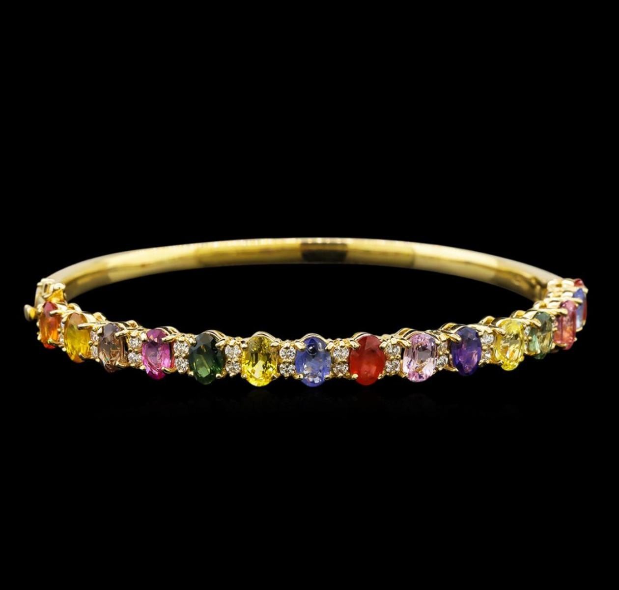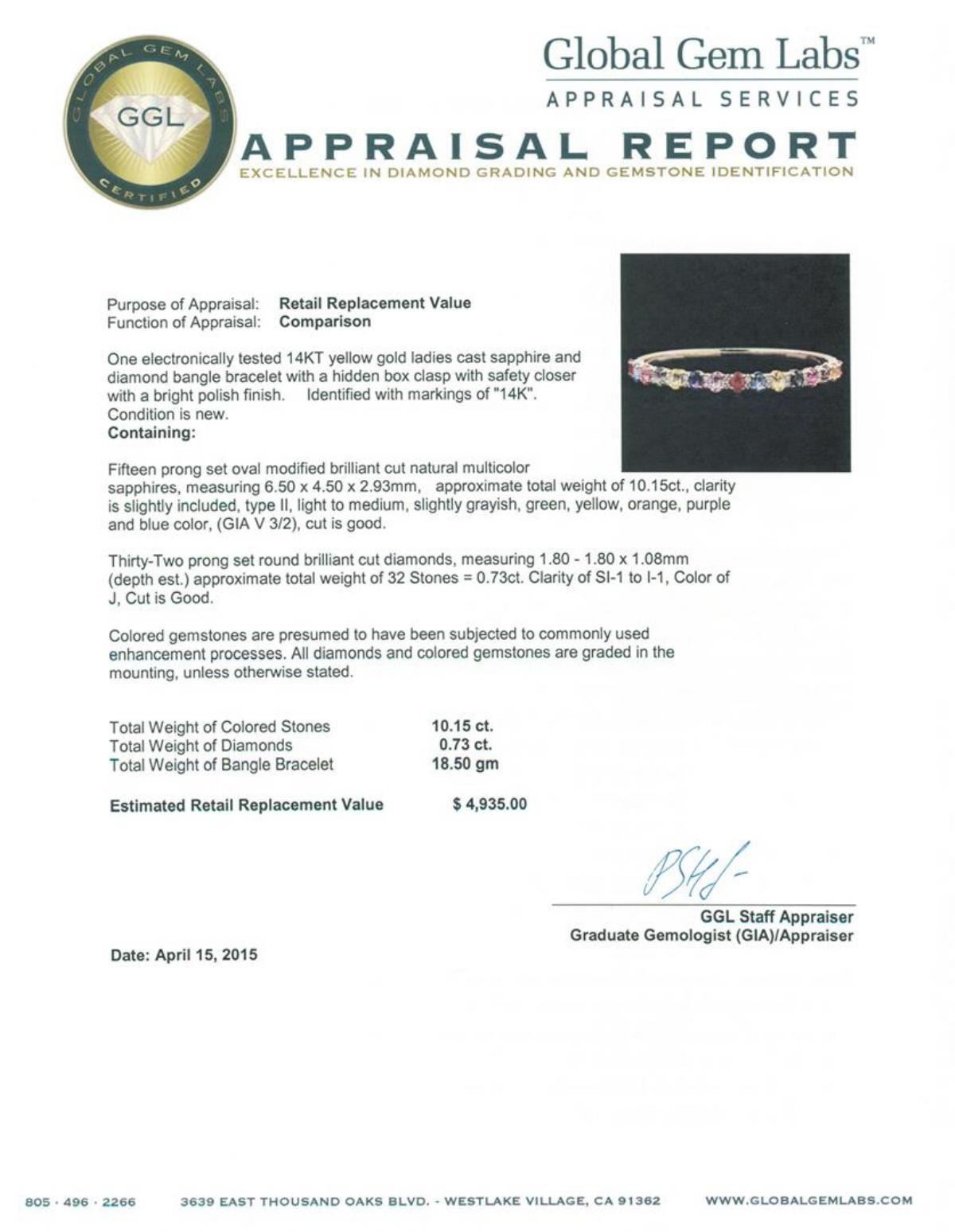 One electronically tested 14KT yellow gold ladies cast sapphire and diamond bangle bracelet with a hidden box clasp with safety closer with a bright polish finish. Identified with markings of "14K". Condition is new. Containing: Fifteen prong set oval modified brilliant cut natural multicolor sapphires, measuring 6.50 x 4.50 x 2.93mm, approximate total weight of 10.15ct., clarity is slightly included, type II, light, slightly grayish, green, yellow, orange, purple, and blue color, (GIA V 3/2), cut is good. Thirty-Two prong set round brilliant cut diamonds, measuring 1.80 - 1.80 x 1.08mm (depth est.) approximate total weight of 32 Stones = 0.73ct. Clarity: SI-1 to I-1. Color: J, Cut is Good. Colored gemstones are presumed to have been subjected to commonly used enhancement processes. All diamonds and colored gemstones are graded in the mounting, unless otherwise stated. Total Weight of Colored Stones 10.15ct. Total Weight of Diamonds 0.73ct. Total Weight of Bangle Bracelet 18.50 grams. GGL Appraised.