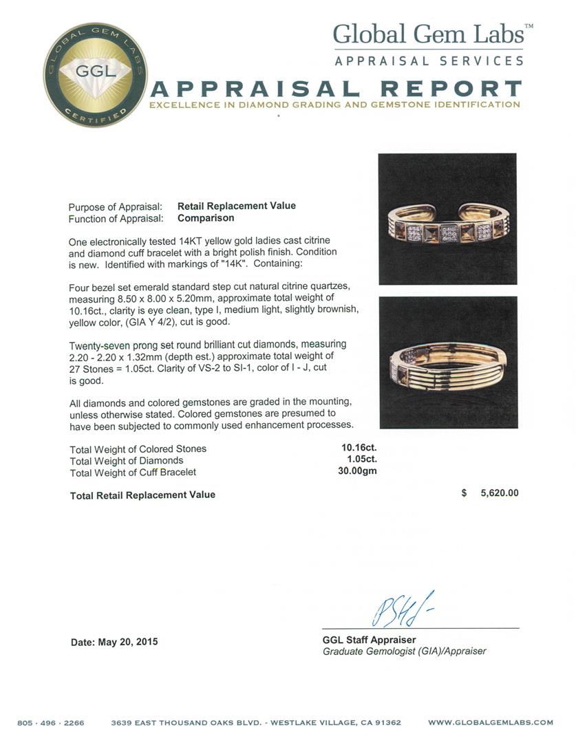 One electronically tested 14KT yellow gold ladies cast citrine and diamond cuff bracelet with a bright polish finish. Identified with markings of "14K". Condition is new. Containing: Four bezel set emerald standard step cut natural citrine quartzes, measuring 8.50 x 8.00 x 5.20mm, approximate total weight of 10.16ct., clarity is eye clean, type I, medium light, slightly brownish, yellow color, (GIA Y 4/2), cut is good. Twenty-Seven prong set round brilliant cut diamonds, measuring 2.20 - 2.20 x 1.32mm (depth est.) approximate total weight of 27 Stones = 1.05ct. Clarity: VS-2 to SI-1. Color: I - J, Cut is Good. All diamonds and colored gemstones are graded in the mounting, unless otherwise stated. Colored gemstones are presumed to have been subjected to commonly used enhancement processes. Total Weight of Colored Stones 10.16ct. Total Weight of Diamonds 1.05ct. Total Weight of Cuff Bracelet 30.00 grams. GGL Appraised at $5,620.00.