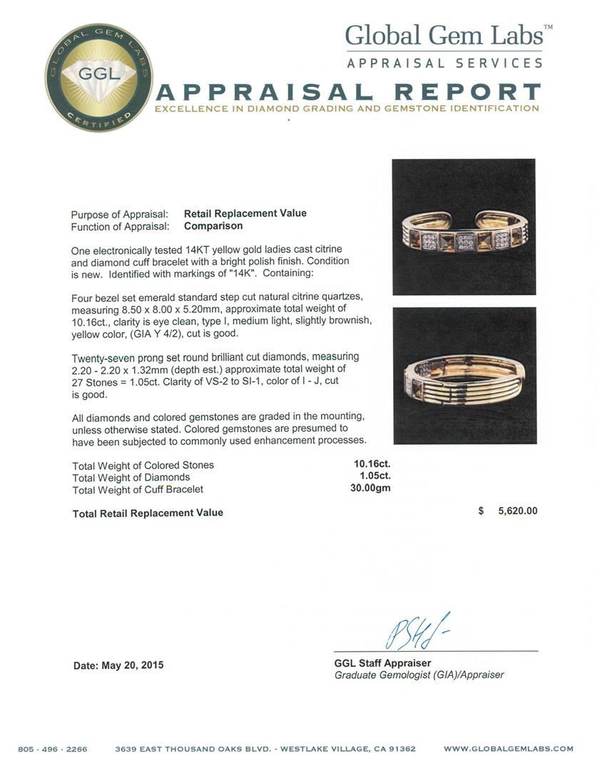 One electronically tested 14KT yellow gold ladies cast citrine and diamond cuff bracelet with a bright polish finish. Identified with markings of "14K". Condition is new. Containing: Four bezel set emerald standard step cut natural citrine quartzes, measuring 8.50 x 8.00 x 5.20mm, approximate total weight of 10.16ct., clarity is eye clean, type I, medium light, slightly brownish, yellow color, (GIA Y 4/2), cut is good. Twenty-Seven prong set round brilliant cut diamonds, measuring 2.20 - 2.20 x 1.32mm (depth est.) approximate total weight of 27 Stones = 1.05ct. Clarity: VS-2 to SI-1. Color: I - J, Cut is Good. All diamonds and colored gemstones are graded in the mounting, unless otherwise stated. Colored gemstones are presumed to have been subjected to commonly used enhancement processes. Total Weight of Colored Stones 10.16ct. Total Weight of Diamonds 1.05ct. Total Weight of Cuff Bracelet 30.00 grams. GGL Appraised.