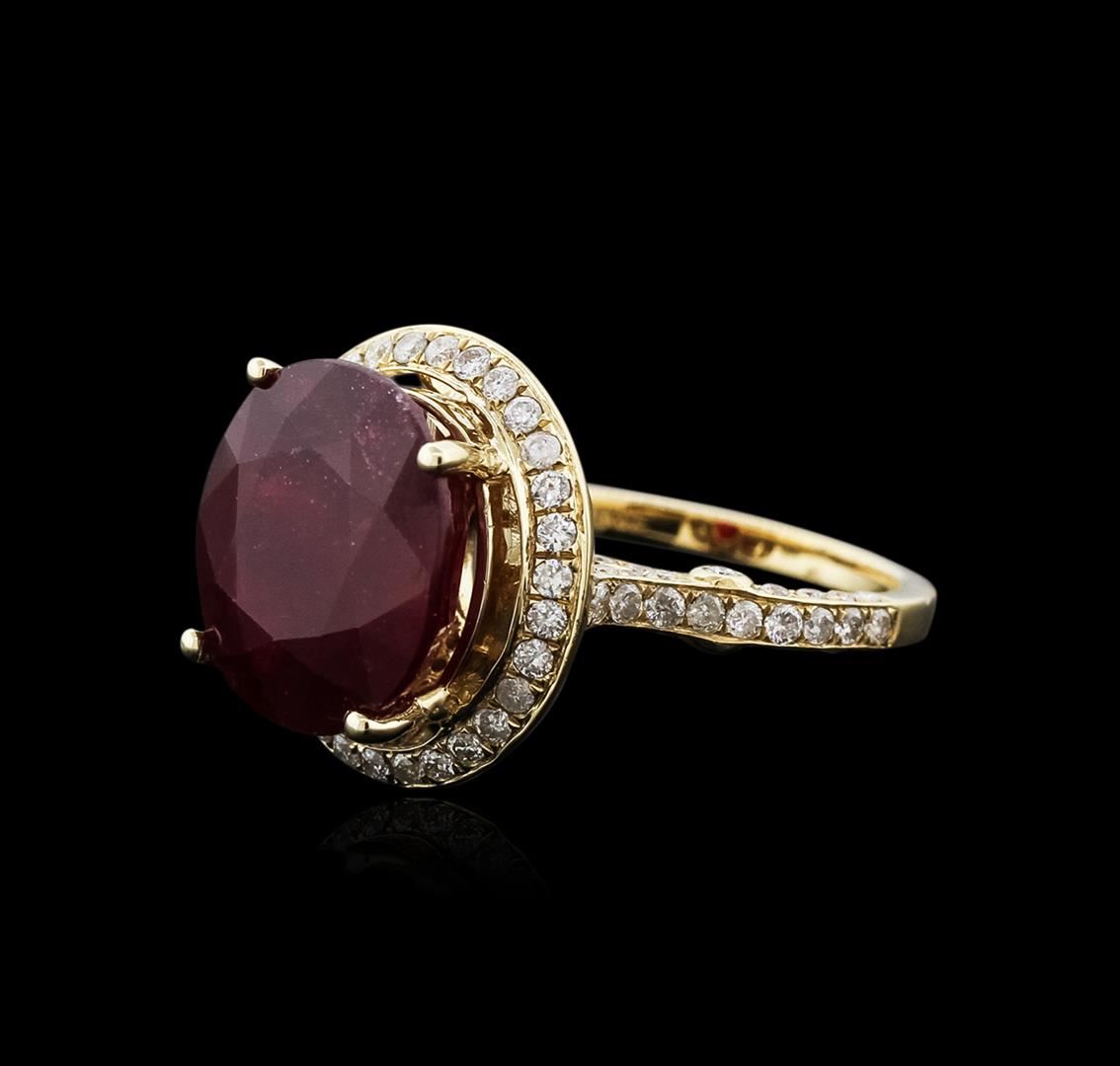 One electronically tested 14KT yellow gold ladies cast ruby and diamond ring with a cathedral shank with a bright polish finish. Trademark is Orianne. Identified with markings of "14K". Condition is new. Containing: One prong set oval modified brilliant cut natural ruby, measuring 13.46 x 12.23 x 7.39mm, approximate weight of 10.22ct., clarity is heavily included, type II, medium dark, very slightly brownish, strongly purplish red color, (GIA stpR 6/3), cut is good. One Hundred Twelve prong set round brilliant cut diamonds, measuring 1.50 - 1.50 x 0.90mm (depth est.) approximate total weight of 112 Stones = 1.38ct. Clarity: I-1 to I-2. Color: J - K. All diamonds and colored gemstones are graded in the mounting, unless otherwise stated. Colored gemstones are presumed to have been subjected to commonly used enhancement processes. Total Weight of Colored Stones 10.22ct. Total Weight of Diamonds 1.38ct. Total Weight of Ring 7.50 grams. GGL Appraised at $4,345.00.