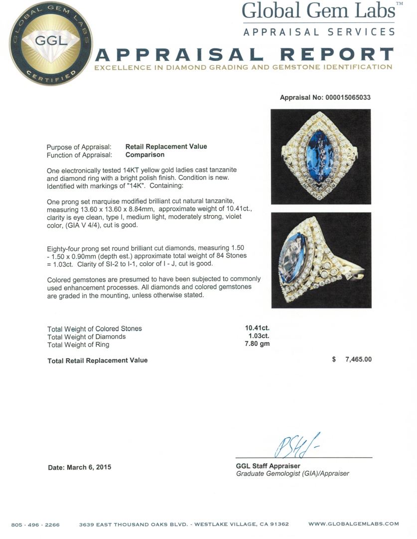 One electronically tested 14KT yellow gold ladies cast tanzanite and diamond ring with a bright polish finish. Identified with markings of "14K". Condition is new. Containing: One prong set marquise modified brilliant cut natural tanzanite, measuring 13.60 x 13.60 x 8.84mm, approximate weight of 10.41ct., clarity is eye clean, type I, medium light, moderately strong, violet color, (GIA V 4/4), cut is good. Eighty-Four prong set round brilliant cut diamonds, measuring 1.50 - 1.50 x 0.90mm (depth est.) approximate total weight of 84 Stones = 1.03ct. . Clarity: SI-2 to I-1. Color: I - J, Cut is Good. Colored gemstones are presumed to have been subjected to commonly used enhancement processes. All diamonds and colored gemstones are graded in the mounting, unless otherwise stated.. Total Weight of Colored Stones 10.41ct.. Total Weight of Diamonds 1.03ct.. Total Weight of Ring 7.80 grams. GGL Appraised at $7,465.00.