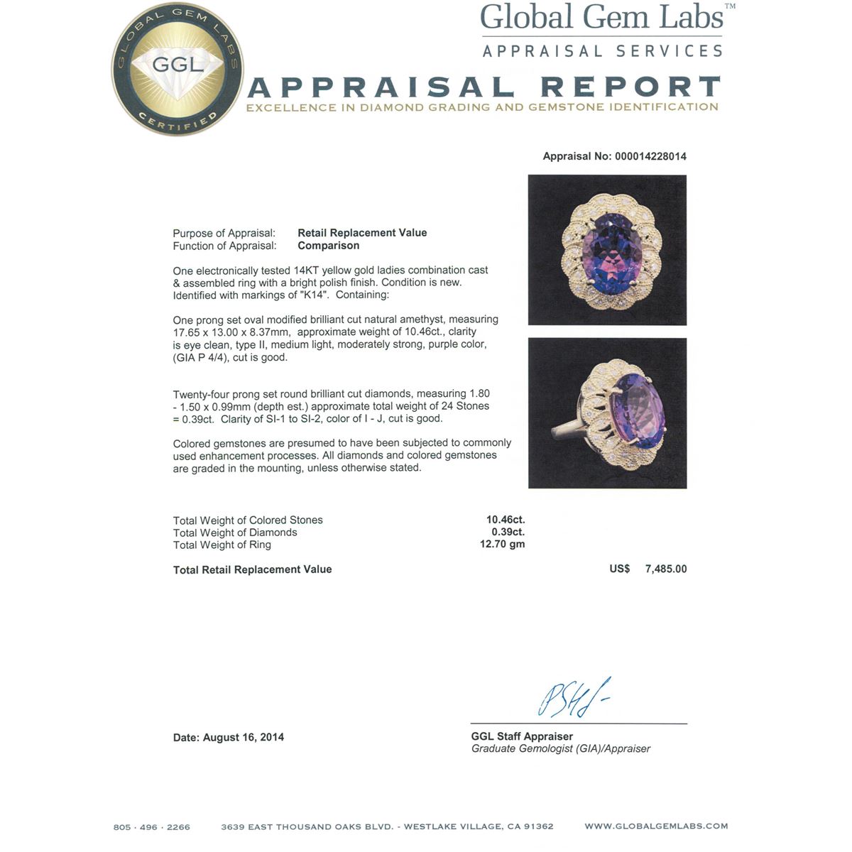 One electronically tested 14KT yellow gold ladies combination cast & assembled ring with a bright polish finish. Condition is new. Identified with markings of "K14". Containing: One prong set oval modified brilliant cut natural amethyst, measuring 17.65 x 13.00 x 8.37mm, approximate weight of 10.46ct., clarity is eye clean, type II, medium light, moderately strong, purple color, (GIA P 4/4), cut is good. Twenty-Four prong set round brilliant cut diamonds, measuring 1.80 - 1.50 x 0.99mm (depth est.) approximate. Total Weight of 24 Stones = 0.39ct. Clarity: SI-1 to SI-2. Color: I - J, Cut is Good. Colored gemstones are presumed to have been subjected to commonly used enhancement processes. All diamonds and colored gemstones are graded in the mounting, unless otherwise stated. Total Weight of Colored Stones 10.46ct. Total Weight of Diamonds 0.39ct. Total Weight of Ring 12.70 grams. GGL Appraised at $7,485.00.