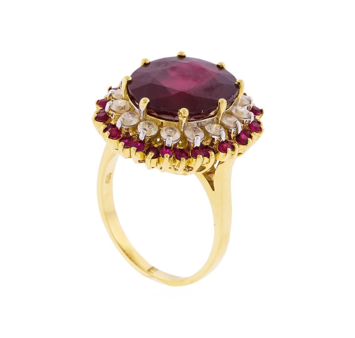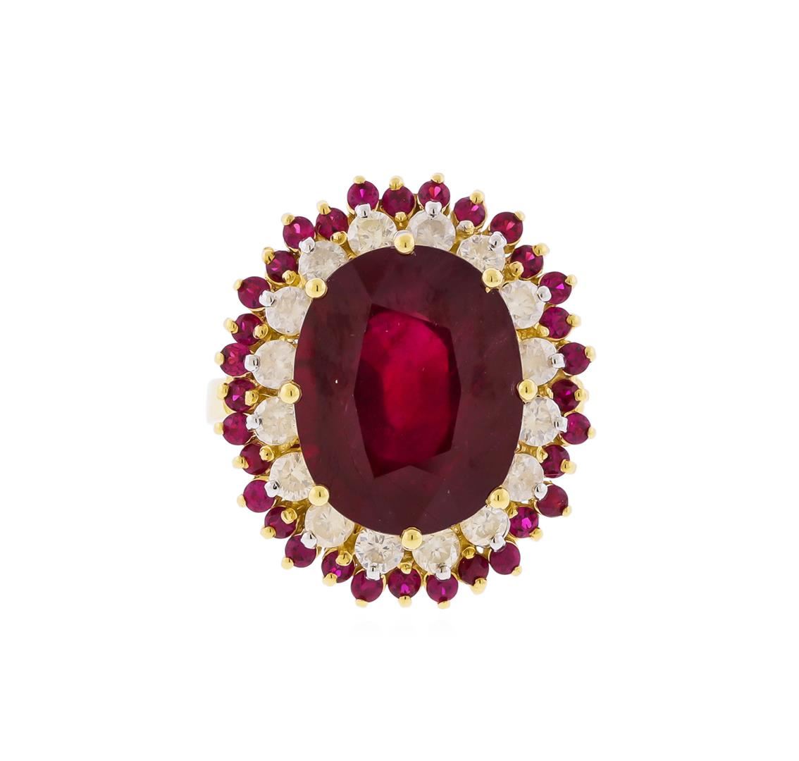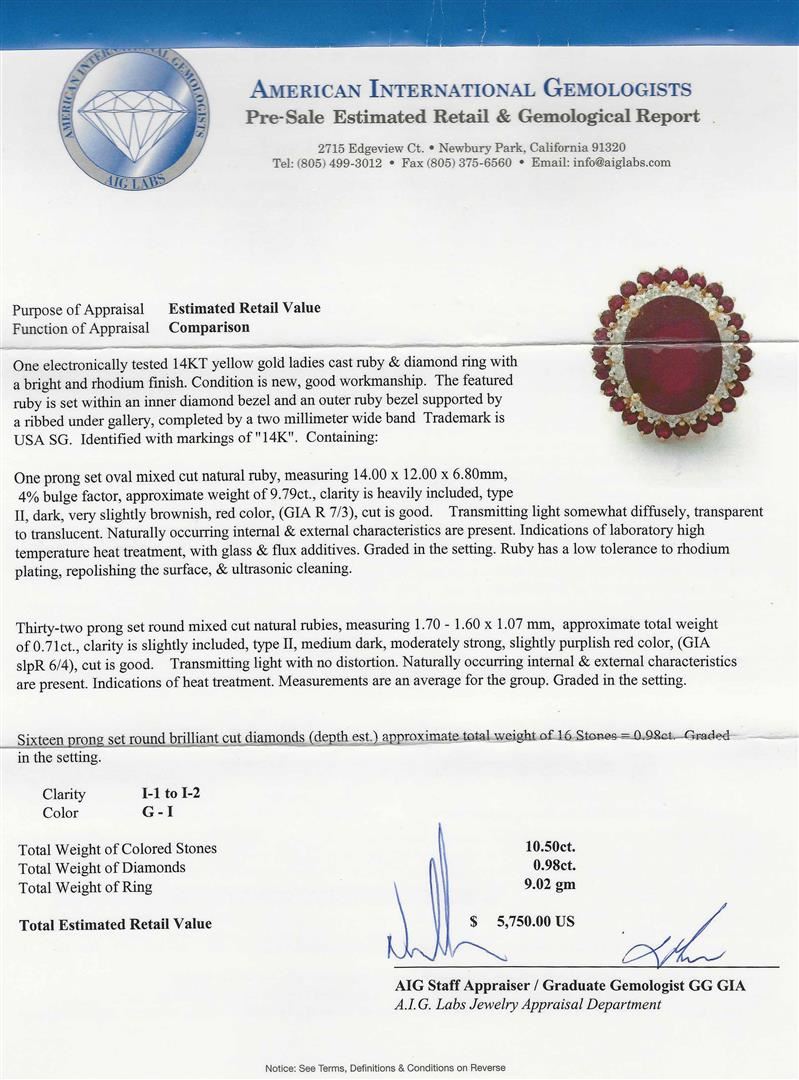 One electronically tested 14KT yellow gold ladies cast ruby & diamond ring with a bright and rhodium finish. The featured ruby is set within an inner diamond bezel and an outer ruby bezel supported by a ribbed under gallery, completed by a two millimeter wide band Trademark is USA SG. Identified with markings of "14K". Condition is new, good workmanship. Containing: One prong set oval mixed cut natural ruby, measuring 14.00 x 12.00 x 6.80mm, 4%. bulge factor, approximate weight of 9.79ct., clarity is heavily included, type II, dark, very slightly brownish, red color, (GIA R 7/3), cut is good. Transmitting light somewhat diffusely, transparent to translucent. Naturally occurring internal & external characteristics are present. Indications of laboratory high temperature heat treatment, with glass & flux additives. Graded in the setting. Ruby has a low tolerance to rhodium plating, repolishing the surface, & ultrasonic cleaning.Thirty-two prong set round mixed cut natural rubies, measuring 1.70 - 1.60 x 1.07 mm, approximate total weight of 0.71ct., clarity is slightly included, type II, medium dark, moderately strong, slightly purplish red color, (GIA slpR 6/4), cut is good. Transmitting light with no distortion. Naturally occurring internal & external characteristics are present. Indications of heat treatment. Measurements are an average for the group. Graded in the setting.Sixteen prong set round brilliant cut diamonds (depth est.) approximate total weight of 16 Stones = 0.98ct. Graded in the setting. Clarity: I-1 to I-2. Color: G - I. Total Weight of Colored Stones 10.50ct. Total Weight of Diamonds 0.98ct. AIG Appraised at $5,750.00.