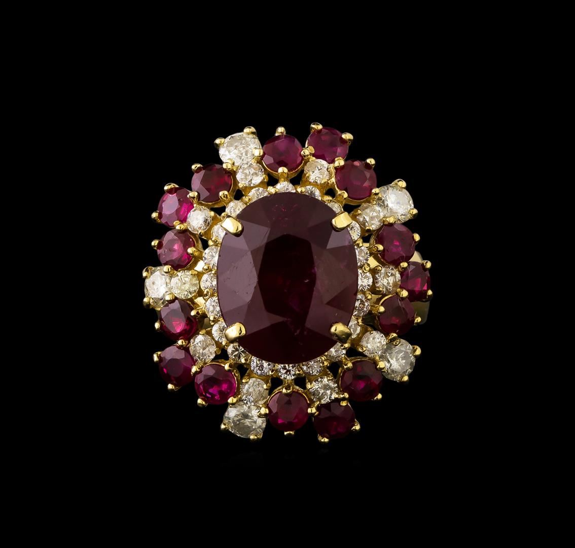 One electronically tested 14KT yellow gold ladies cast ruby and diamond ring with a bright polish finish. The featured ruby is set within multiple tiered ruby and diamond bezels, completed by a four millimeter wide band. Identified with markings of "K14". Condition is new, good workmanship. Containing: One prong set oval mixed cut natural ruby, measuring 12.50 x 10.30 x 7.10mm, 8% bulge factor, approximate weight of 7.97ct., clarity is heavily included, type II, dark, very slightly brownish, slightly purplish red color, (GIA slpR 7/3), cut is good. Transmitting light somewhat diffusely, transparent to translucent. Naturally occurring internal & external characteristics are present. Indications of laboratory high temperature heat treatment, with glass & flux additives. Graded in the setting. Ruby has a low tolerance to rhodium plating, repolishing the surface, & ultrasonic cleaning. Fifteen prong set round mixed cut natural rubies, measuring 3.20 - 3.00 x 2.02 mm, approximate total weight of 2.55ct., clarity is slightly included, type II, dark, very slightly brownish, slightly purplish red color, (GIA slpR 7/3), cut is good. Transmitting light with a minimum of distortion, transparent. Naturally occurring internal & external characteristics are present. Color grade is an average for the group. Graded in the setting. Five prong set round brilliant cut diamonds, measuring 3.20 - 3.00 x 1.86mm (depth est.) approximate total weight of 5 Stones = 0.64ct. Graded in the setting. Clarity: I-1 to I-2. Color: H - I Thirty prong set round brilliant cut diamonds, measuring 2.10 - 1.80 x 1.17mm (depth est.) approximate total weight of 30 Stones = 0.91ct. Graded in the setting. Clarity: SI-2 to I-2. Color: H - J. Total Weight of Colored Stones 10.52ct. Total Weight of Diamonds 1.55ct. Total Weight of Ring 12.23 grams. AIG Appraised at $9,035.00.