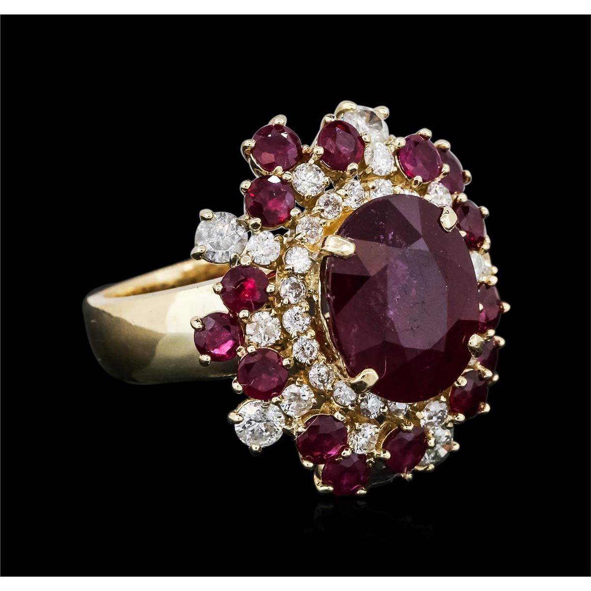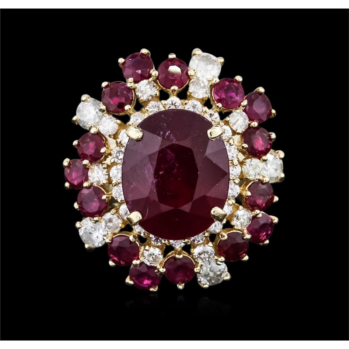 One electronically tested 14KT yellow gold ladies cast ruby and diamond ring with a bright polish finish. The featured ruby is set within multiple tiered ruby and diamond bezels, completed by a four millimeter wide band. Identified with markings of "K14". Condition is new, good workmanship. Containing: One prong set oval mixed cut natural ruby, measuring 12.50 x 10.30 x 7.10mm, 8% bulge factor, approximate weight of 7.97ct., clarity is heavily included, type II, dark, very slightly brownish, slightly purplish red color, (GIA slpR 7/3), cut is good. Transmitting light somewhat diffusely, transparent to translucent. Naturally occurring internal & external characteristics are present. Indications of laboratory high temperature heat treatment, with glass & flux additives. Graded in the setting. Ruby has a low tolerance to rhodium plating, repolishing the surface, & ultrasonic cleaning. Fifteen prong set round mixed cut natural rubies, measuring 3.20 - 3.00 x 2.02 mm, approximate total weight of 2.55ct., clarity is slightly included, type II, dark, very slightly brownish, slightly purplish red color, (GIA slpR 7/3), cut is good. Transmitting light with a minimum of distortion, transparent. Naturally occurring internal & external characteristics are present. Color grade is an average for the group. Graded in the setting. Five prong set round brilliant cut diamonds, measuring 3.20 - 3.00 x 1.86mm (depth est.) approximate total weight of 5 Stones = 0.64ct. Graded in the setting. Clarity: I-1 to I-2. Color: H - I Thirty prong set round brilliant cut diamonds, measuring 2.10 - 1.80 x 1.17mm (depth est.) approximate total weight of 30 Stones = 0.91ct. Graded in the setting. Clarity: SI-2 to I-2. Color: H - J. Total Weight of Colored Stones 10.52ct. Total Weight of Diamonds 1.55ct. Total Weight of Ring 12.23 grams. AIG Appraised at $9,035.00.